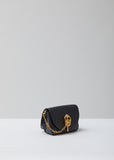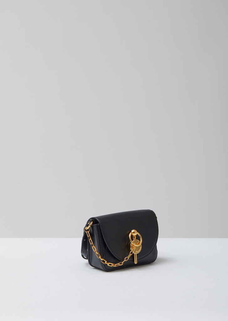 Small black calfskin crossbody bag with a gold-tone curb-chained key that secures through a coordinating branded disc at the front flap. Structured silhouette. Adjustable crossbody strap. Gold-tone brass hardware throughout. Tonal top-stitching throughout. Suede lining.