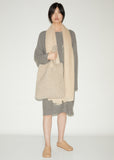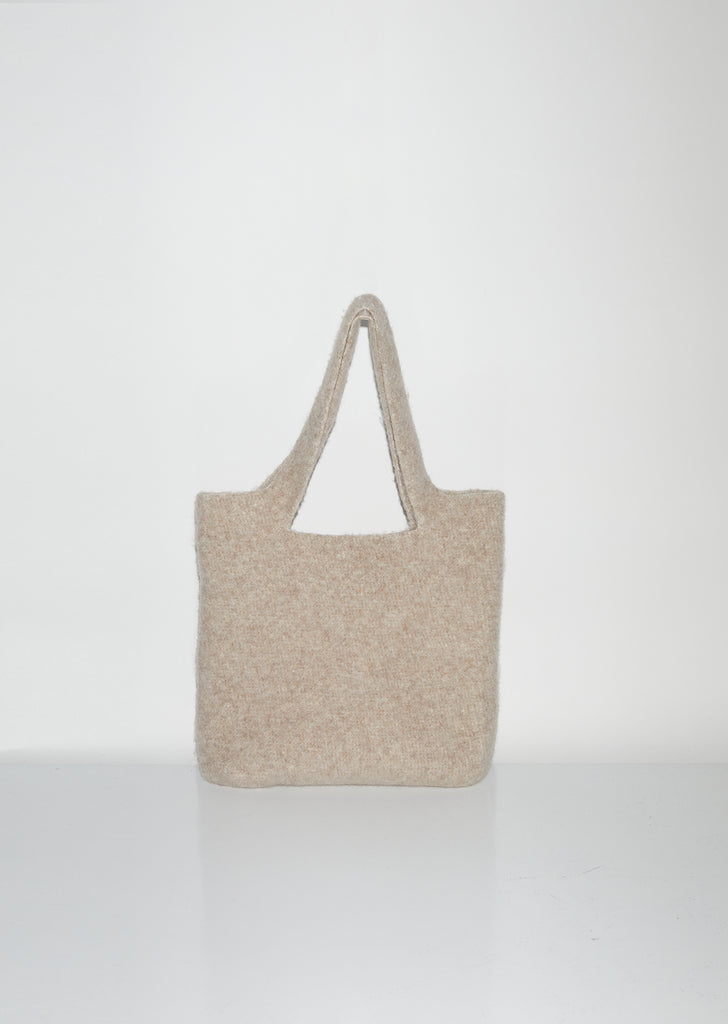 Beige medium-size tote bag hand-crocheted from alpaca blend yarn, brushed for a felted texture.