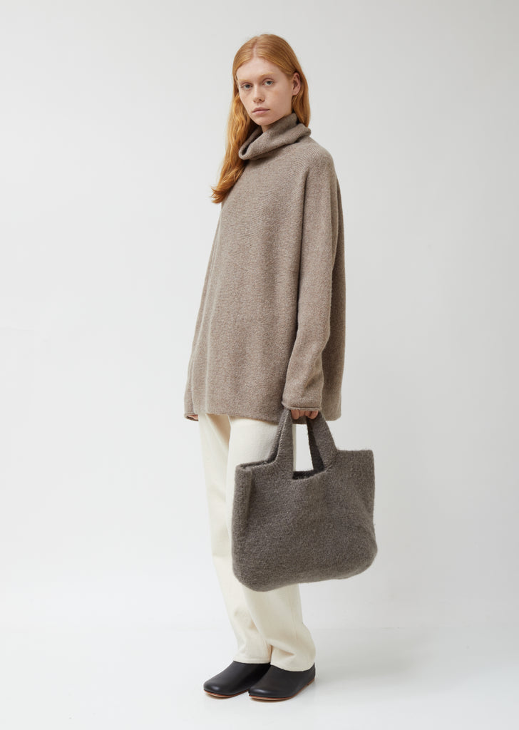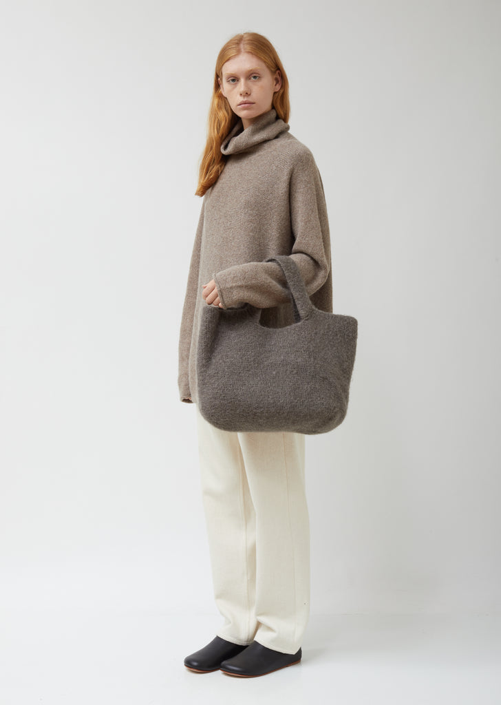 Graphite colored hand-crocheted tote bag in brushed alpaca wool.