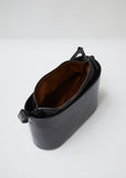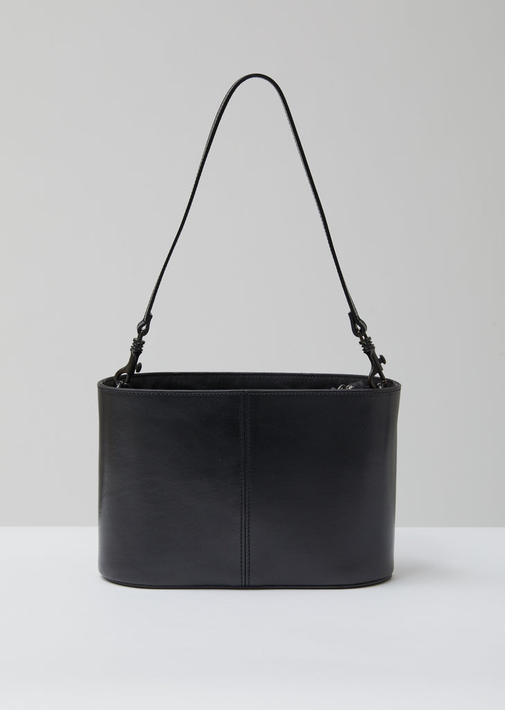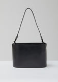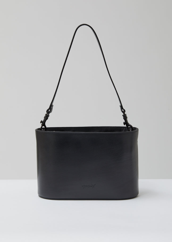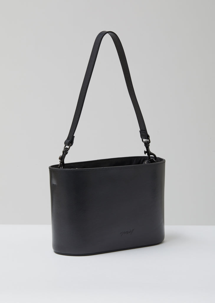 Black calfskin basket-shaped bag with a removable flat shoulder/crossbody strap—a new, structured silhouette for the fall season. Non-woven. Rounded profile. Recessed zip-top closure with tonal leather pull. Adjustable shoulder/crossbody strap with tonal lanyard fastening. Debossed logo at front face. Chocolate leather lining.