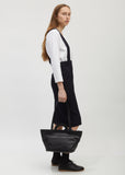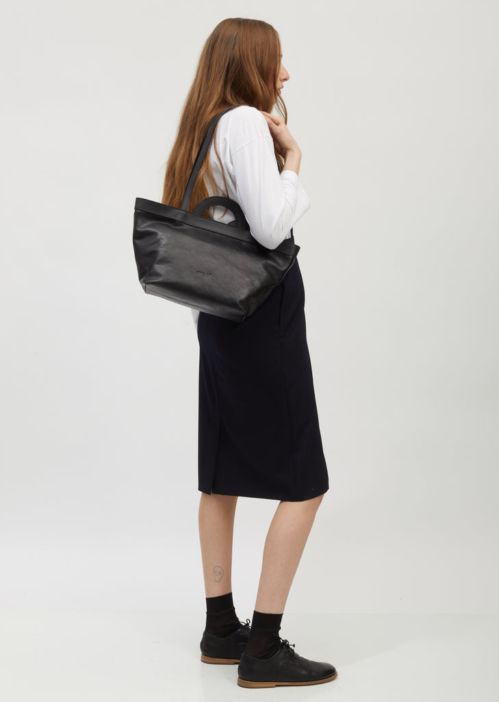 Black leather shoulder bag with a small embossed logo, two flat top handles, two longer flat shoulder straps, and a zip fastening at the top.