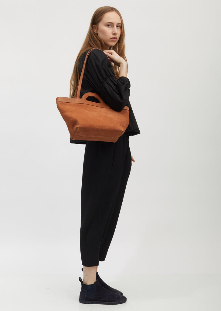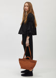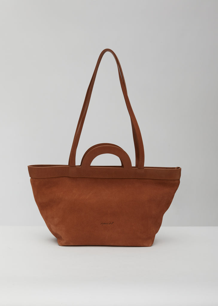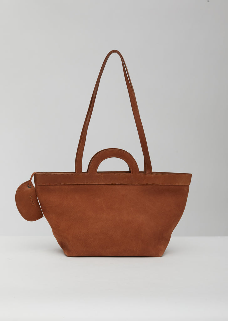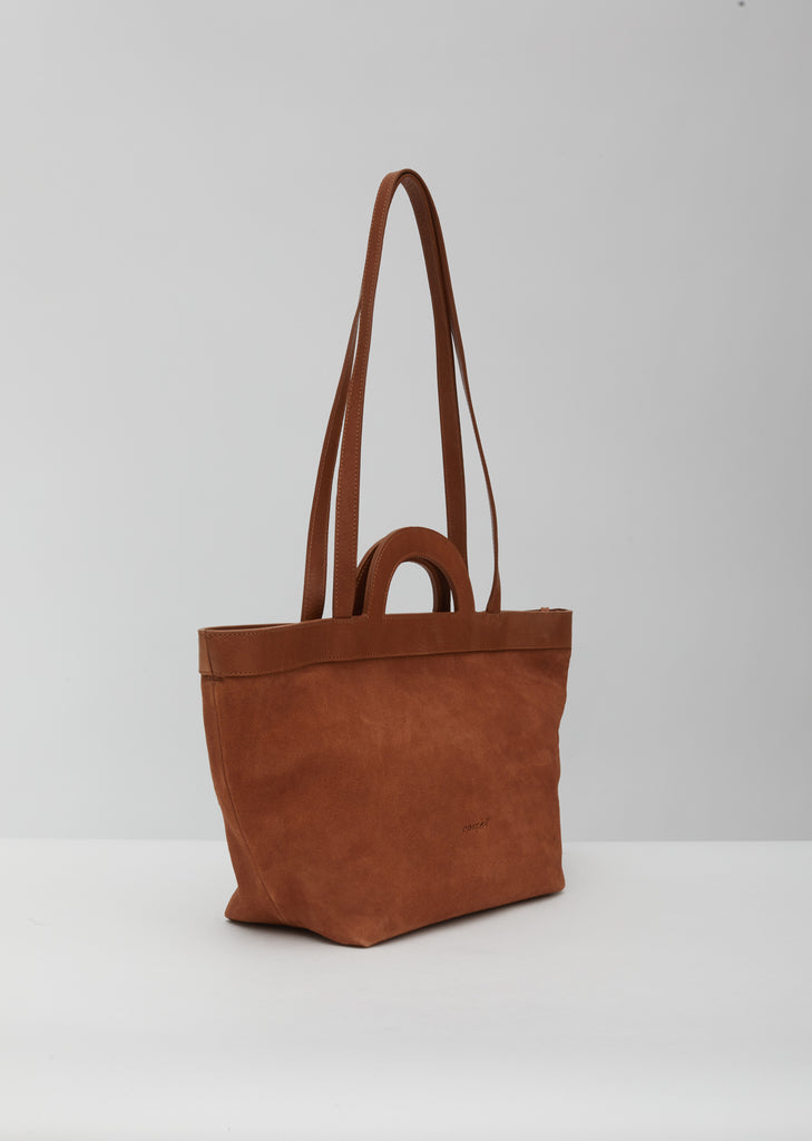 Cork brown suede shoulder bag with a small embossed logo, two flat top handles, two longer flat shoulder straps, and a zip fastening at the top.
