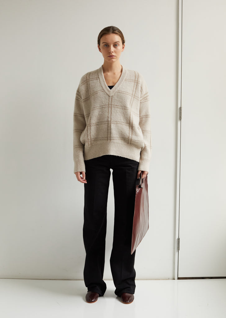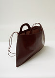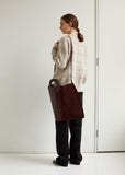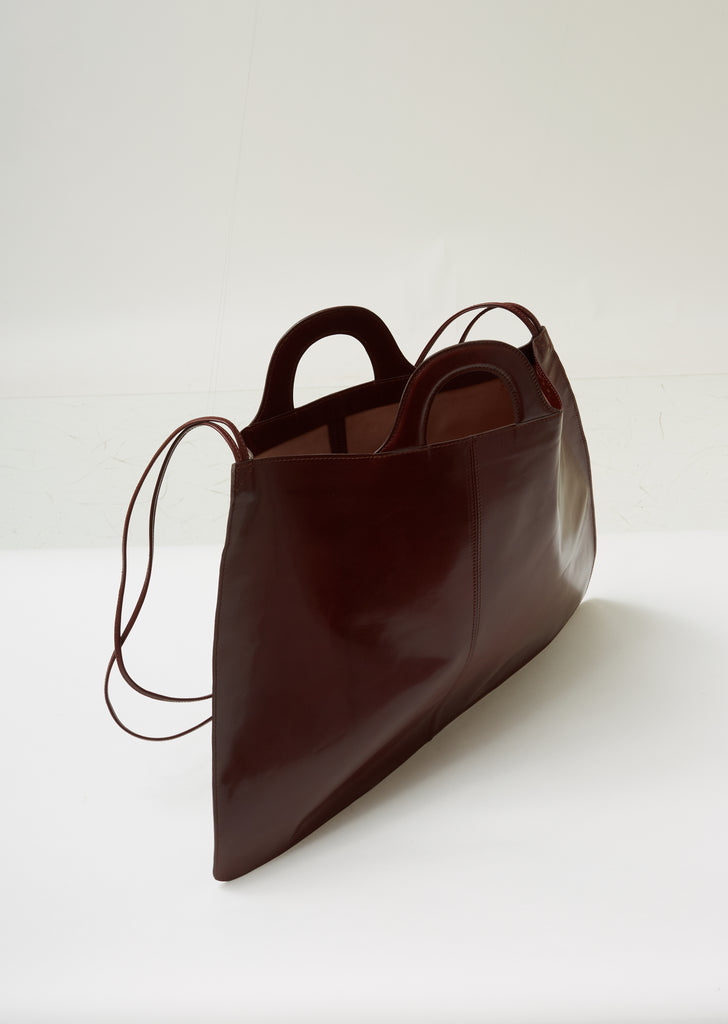 New category from Martiniano. Oversized and lightweight flat tote bag handcrafted from thin oxblood leather, finished with self-leather top handles and shoulder/crossbody straps. Slight trapezoidal silhouette. Open top. Structured, integrated top handles. Thin carry straps. Center seams at front and back face. Tonal stitching. Single interior compartment molds organically with wear. Unlined.