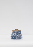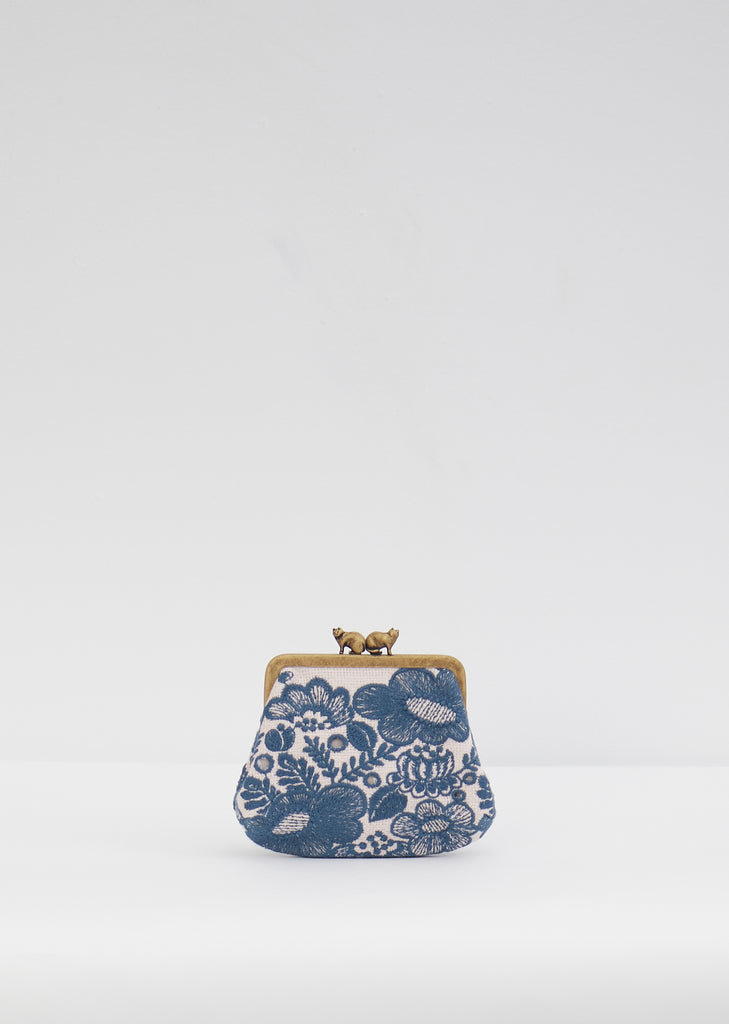 Minä Perhonen Cuddle Purse in light pink with blue floral pile embroidery. This signature clutch from the label features antiqued gold-tone brass frame and cat-figurine kiss-lock closure at topline.