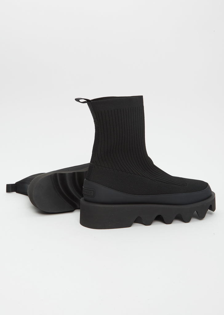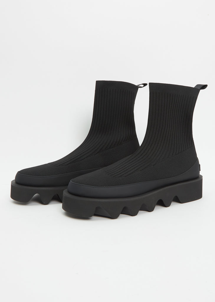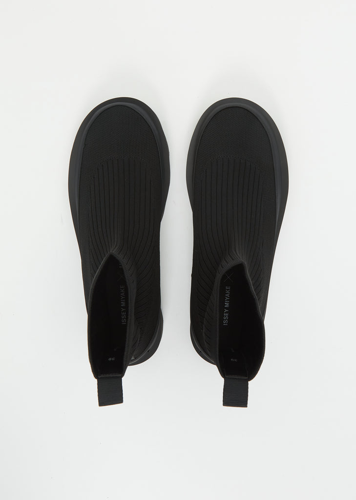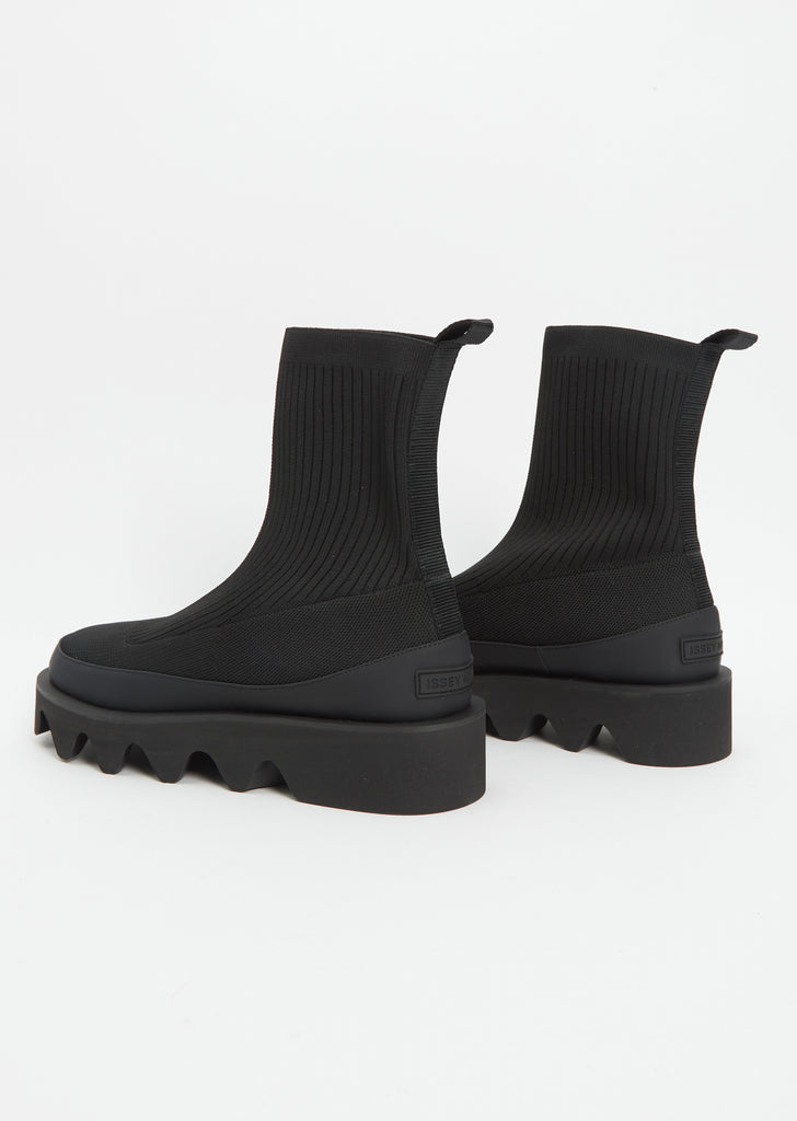Issey Miyake x United Nude black slip-on boot crafted in a recycled knit with a chunky, undulating outsole. Aimed to reflect one of Issey Miyake's core concepts - comfort, this ankle boot features a light and flexible outsole, a rounded toe, tonal leather detailing, a pull tab at the heel for easy dressing, and an Issey Miyake logo at the heel.