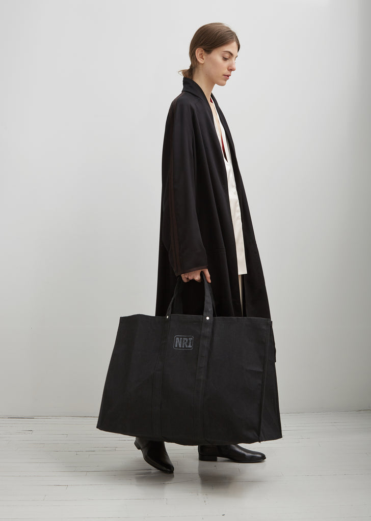 A large rectangular tote bag in durable cotton canvas from PUEBCO, the Tokyo-based purveyor of sustainable, practical accessories. Reinforced top handles. Metal rivets. “NRI” stencil graphic on front.
