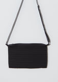 Pleats Please Bouncy Pleats Bag in black. Small, lightweight bag with signature pleating with zipper top closure and shoulder strap.