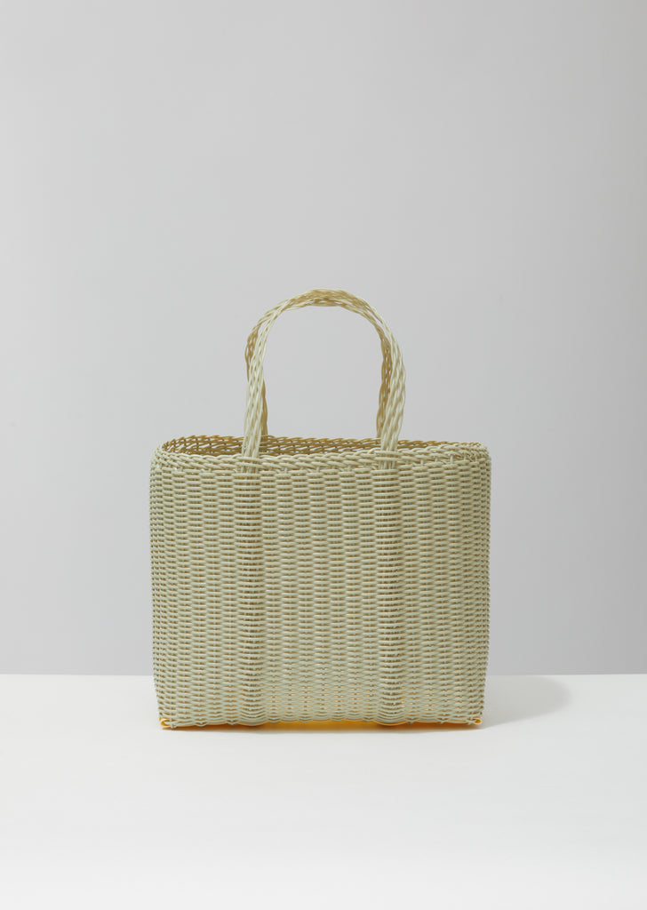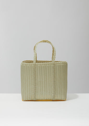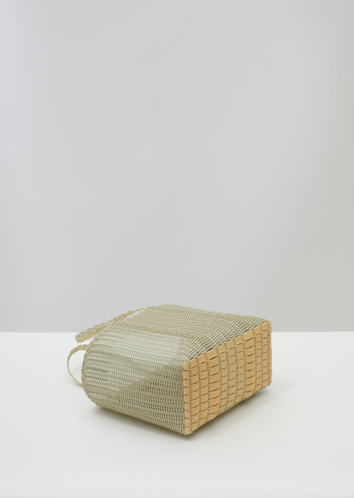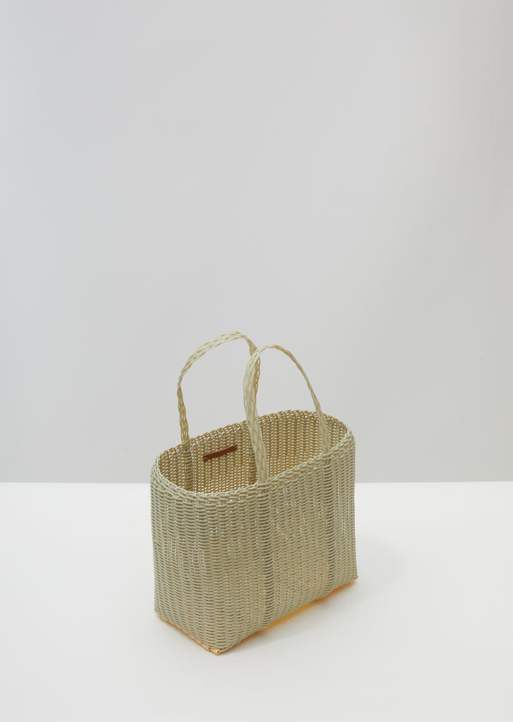 Pale-green small basket tote handwoven by local artisans in Guatemala from recycled plastic using traditional techniques.