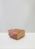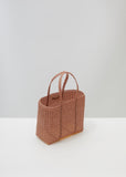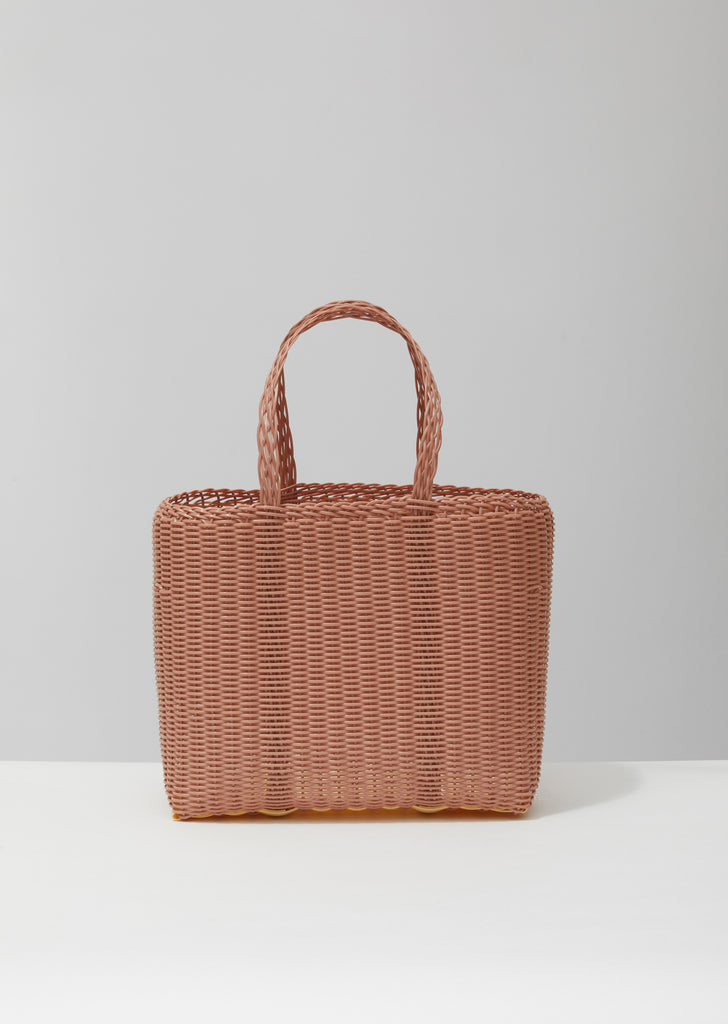 Rose-colored small basket tote handwoven by local artisans in Guatemala from recycled plastic using traditional techniques.