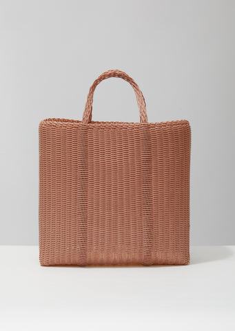 Rose-colored large basket tote handwoven by local artisans in Guatemala from recycled plastic using traditional techniques.