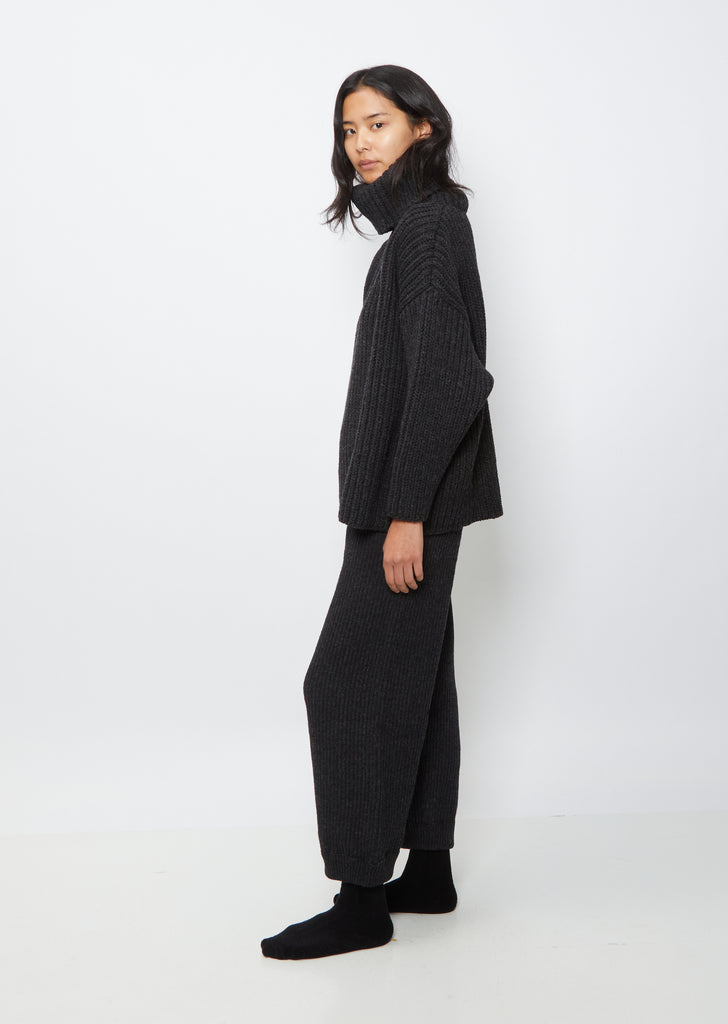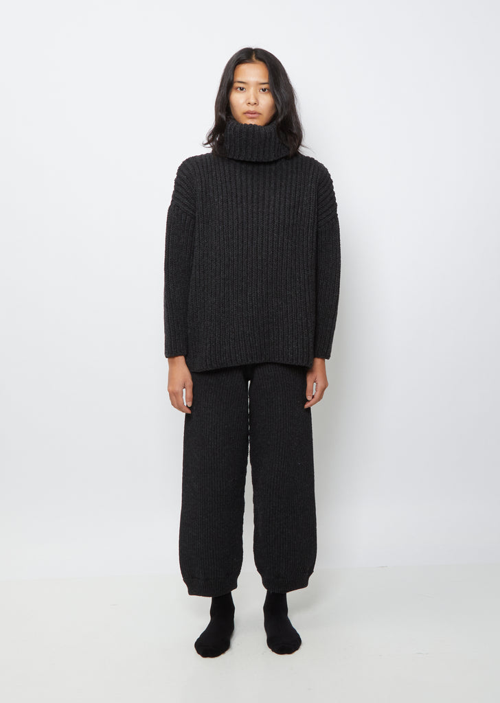 Baserange dark grey melange chunky rib knit turtleneck in wool. Features a drop shoulder and an exaggerated roll turtleneck. Slightly oversized fit.
