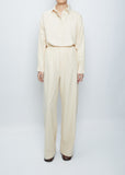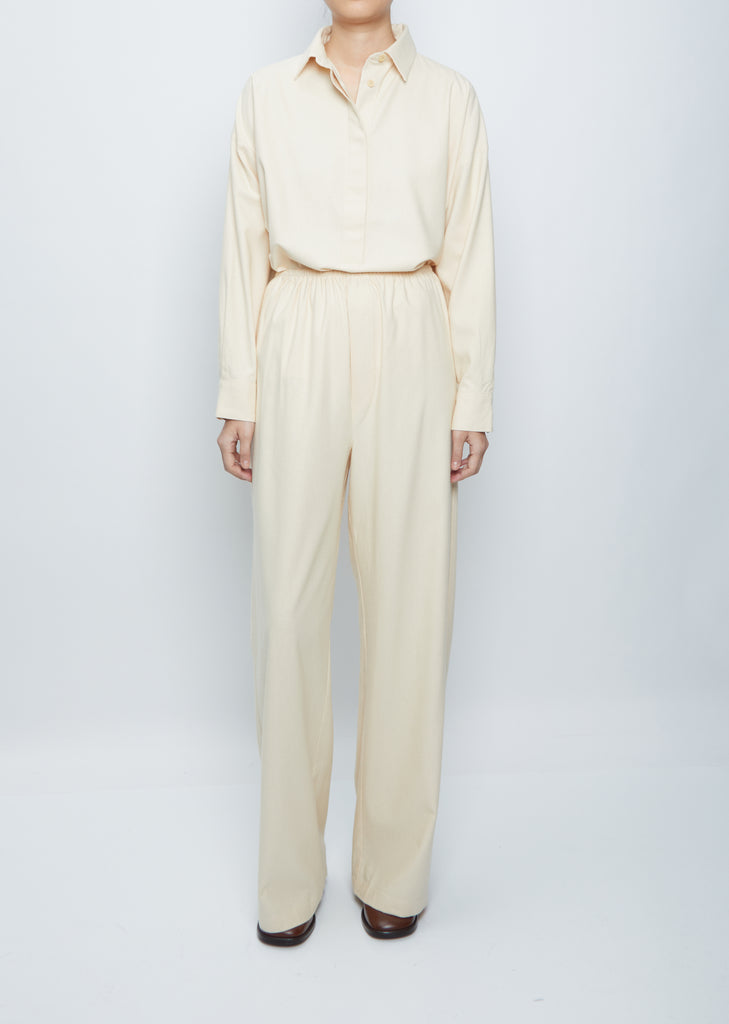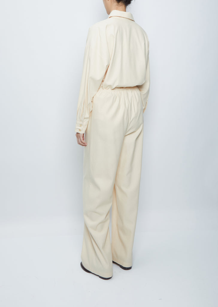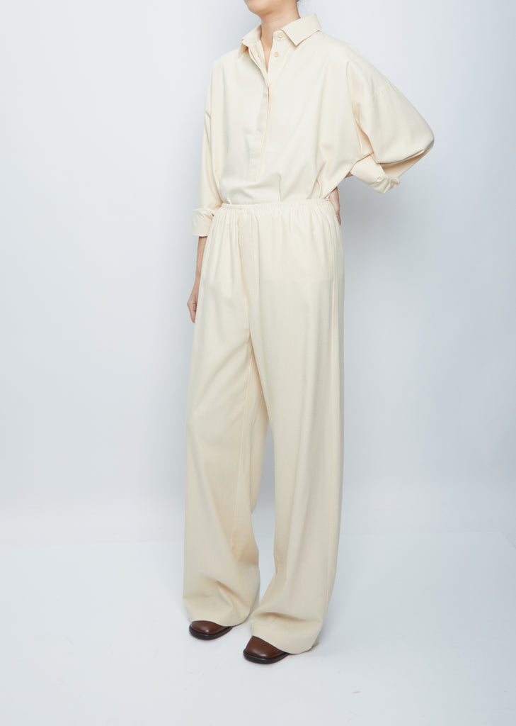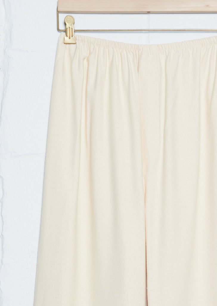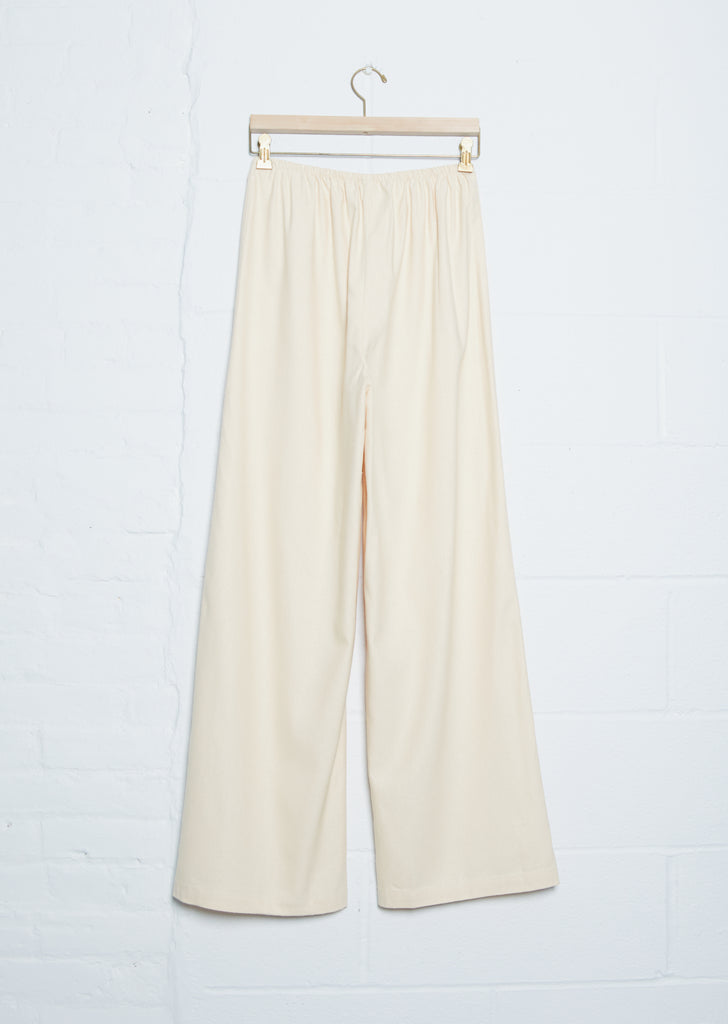 Baserange ecru high-waisted wide-leg elastic waist pants in a textured raw silk.