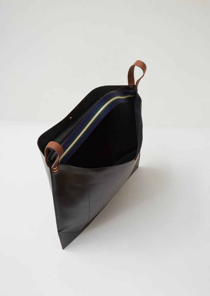 Square-shaped tote bag in semi-glossy black calfskin, featuring contrast webbed twin top handles with blue, green, and white stripes. Designed for hand-carrying. Magnetic-tab closure at topline. Brown leather loops at sides of topline; polished metal stud details. Single interior compartment. Interior envelope pocket with gold stamped logo.