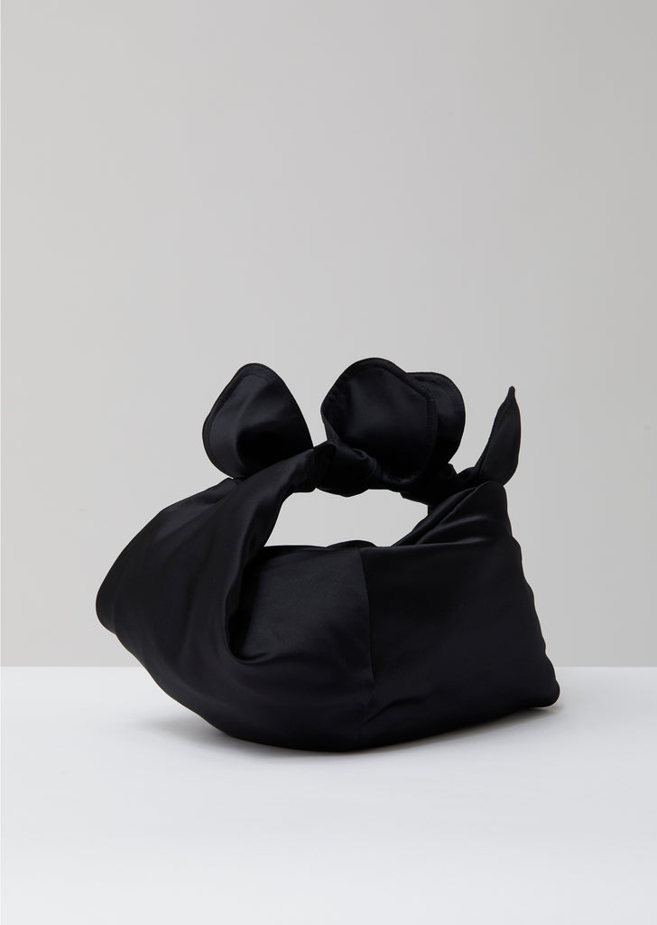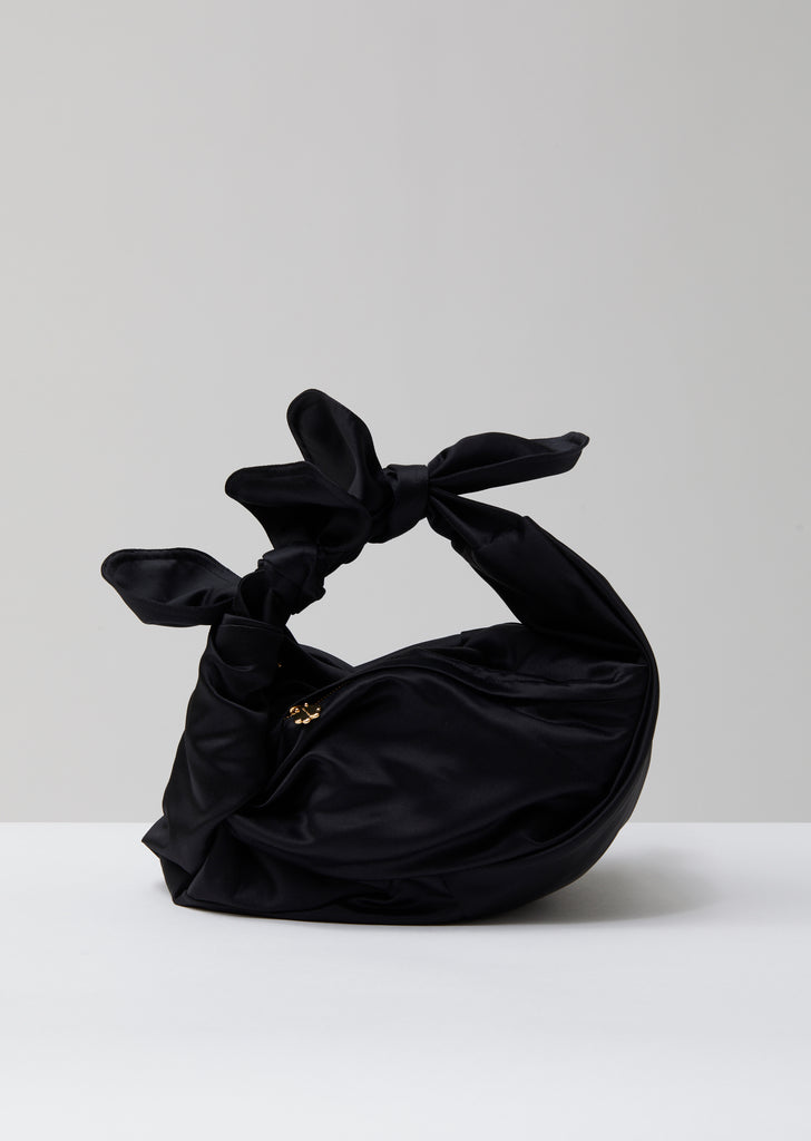 Crescent-shaped black satin-twill handbag with a single carry handle constructed from two bow knots. Unstructured. Gold-tone-metal zip-top closure. Side pocket. Spacious interior.