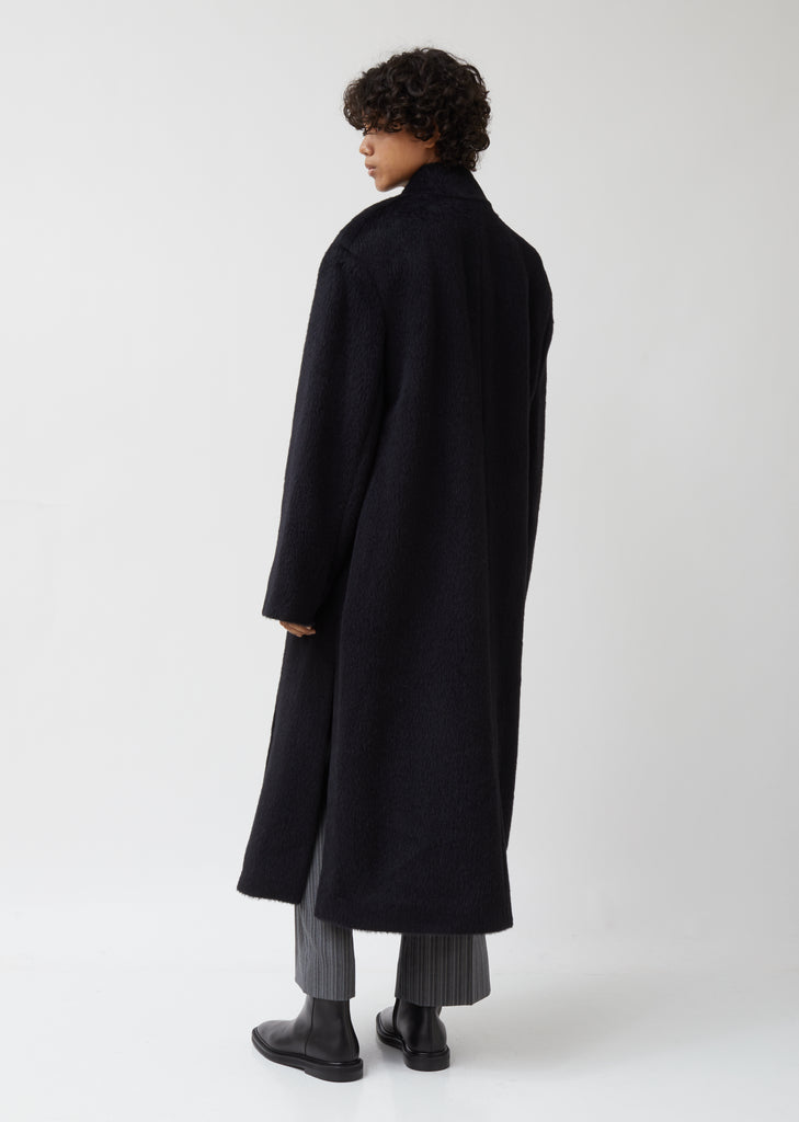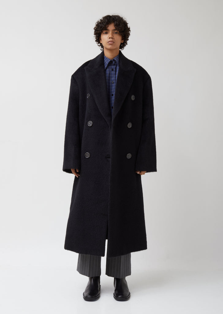 Oversized double-breasted coat cut from black brushed alpaca-wool melton. Peak lapels. Drop shoulders. Long, wide sleeves. 6x2 double-breasted closure. On-seam side pockets. Side-seam slits. Straight hem falls to lower calf. Straight, oversized fit.
