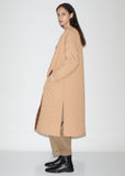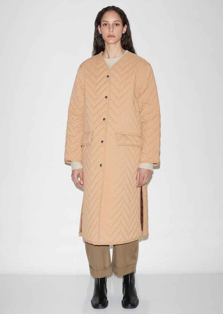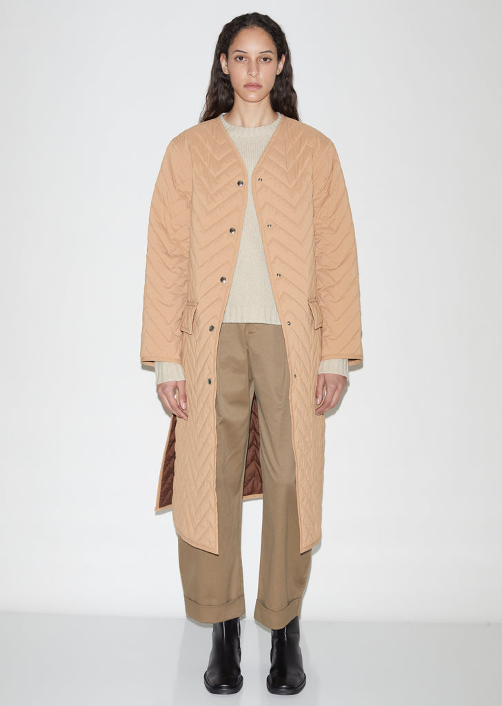 Beige collarless quilted coat in tech taffeta, lightly padded and stitched in a herringbone-inspired chevron pattern.