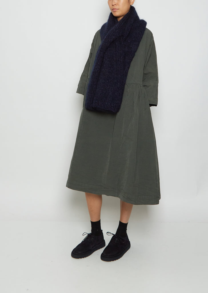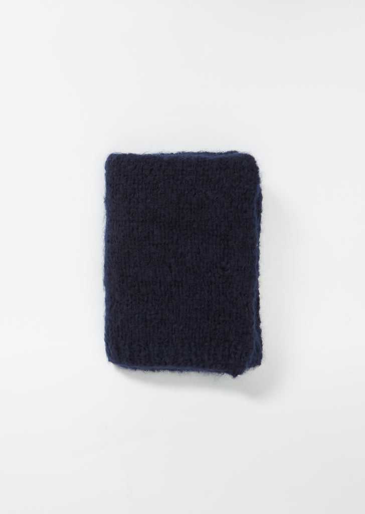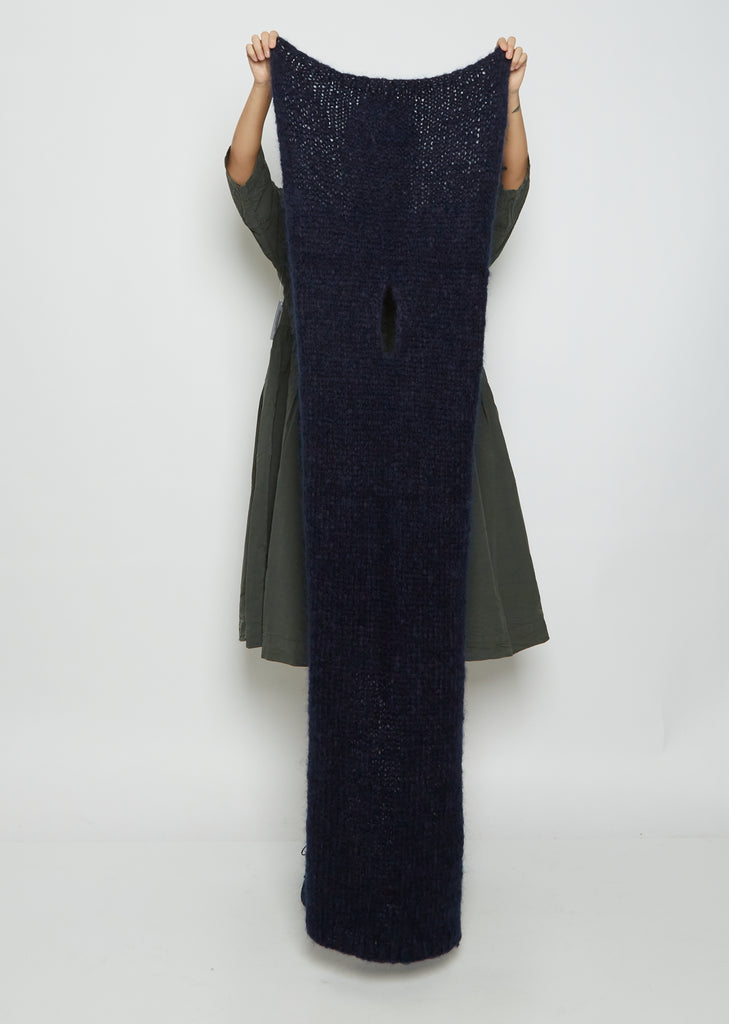 Casey Casey navy blue rectangular scarf with slit in a chunky hand knit kid mohair yarn.