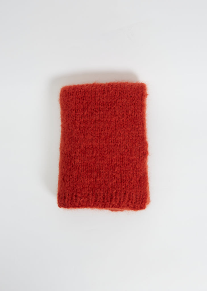 Casey Casey rust rectangular scarf with slit in a chunky hand knit kid mohair yarn.