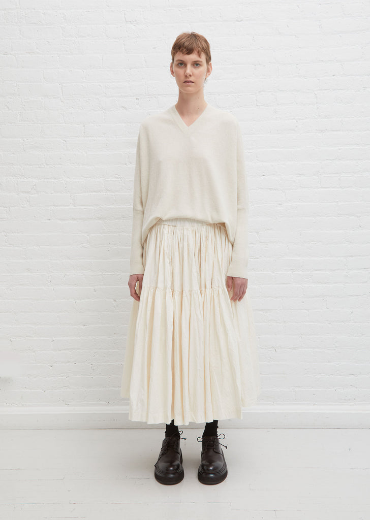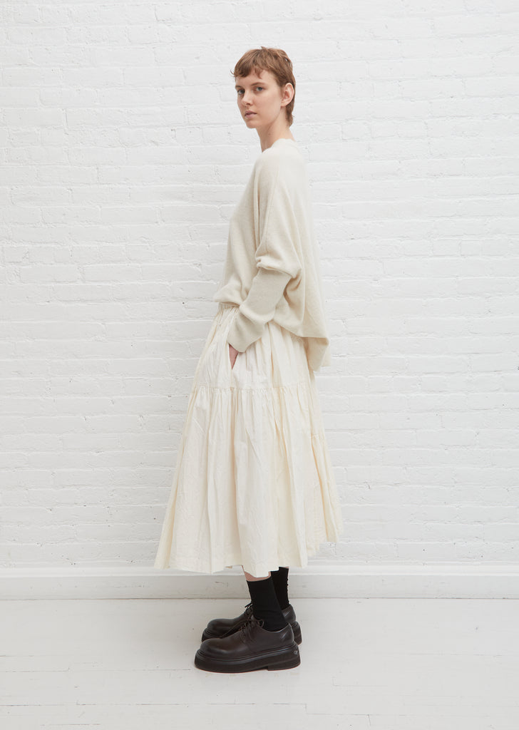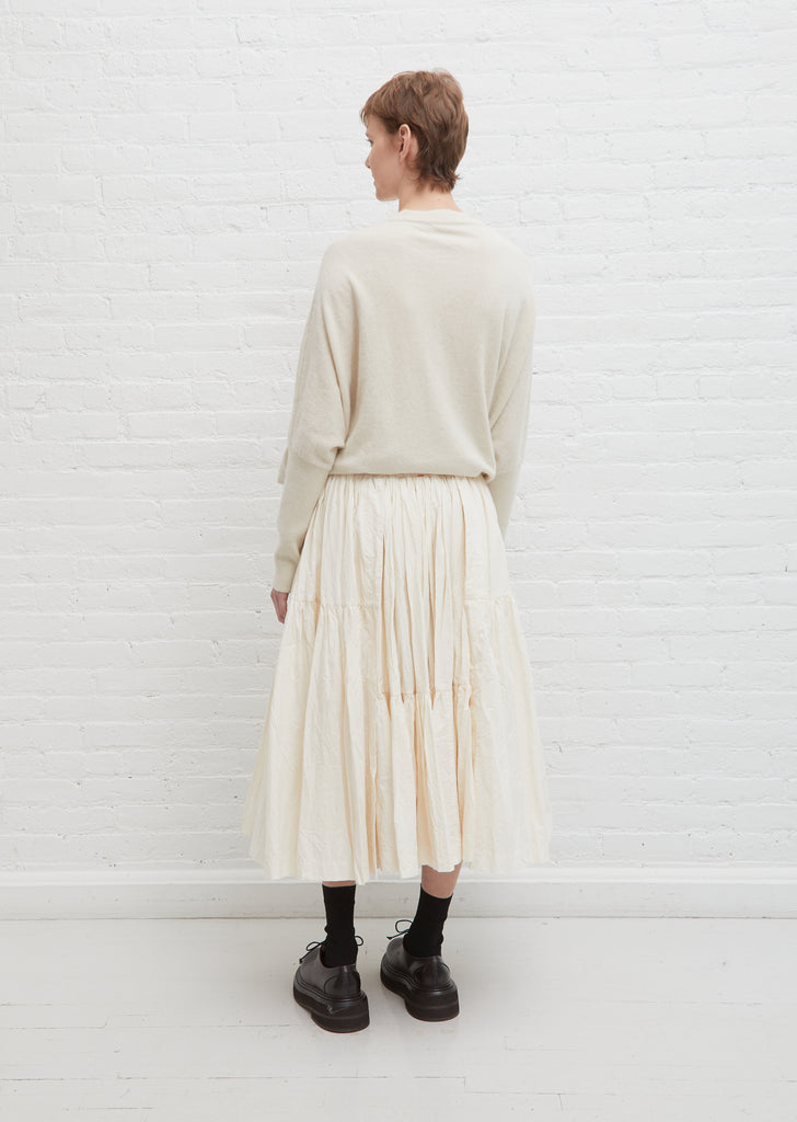 Casey Casey tiered full skirt with self-covered elasticated waist in natural-tone washed cotton. Tonal inner drawcord. Concealed side seam pockets. Full silhouette with a midi-length hem.
