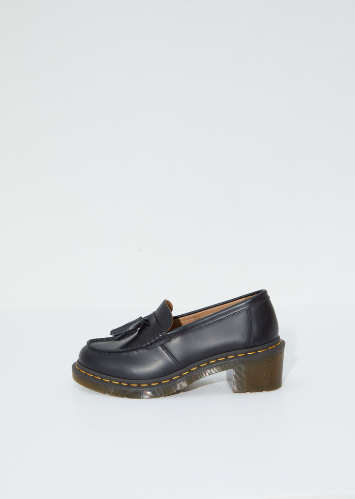 CdG CdG x Dr. Martens Heeled Tassle Loafer in black. Classic collaboration tassel loafer in premium leather with yellow stitch detailing with a low block heel. Leather  insole with signature rubber outsole.