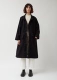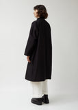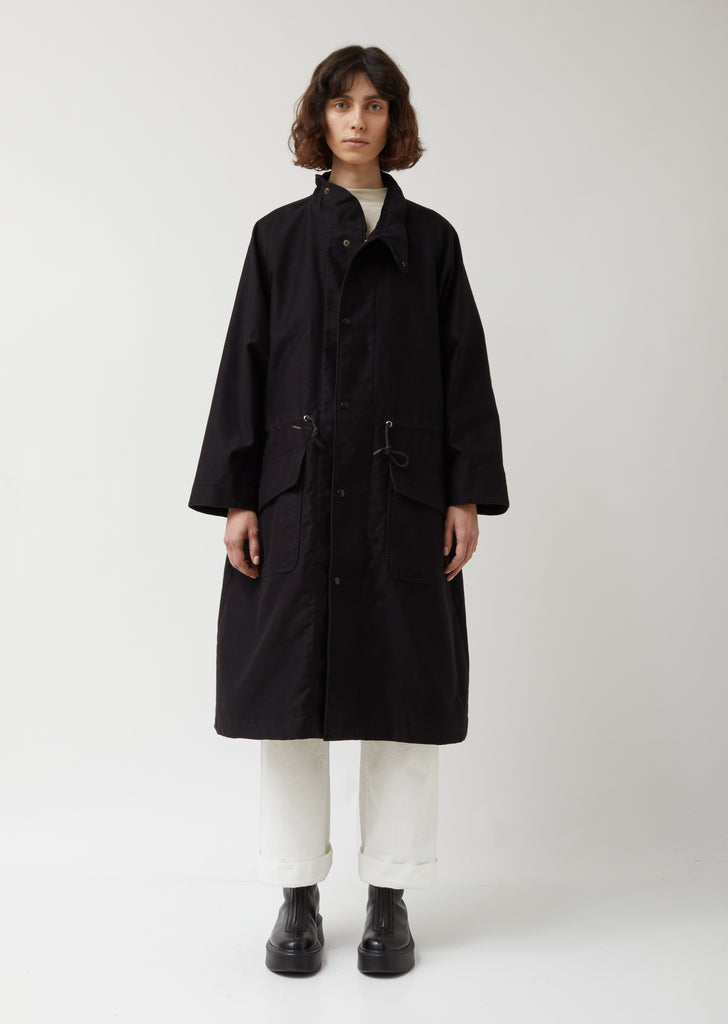 Knee-length trapeze coat crafted from black brushed cotton moleskin. Corduroy-faced stand collar. Long raglan sleeves. Snap-button front closure. Black snap buttons. Cased self-tie tonal drawcord at high waist. Flap front pockets at hips. Snap-button fastening at back vent. Straight hem. Relaxed fit.