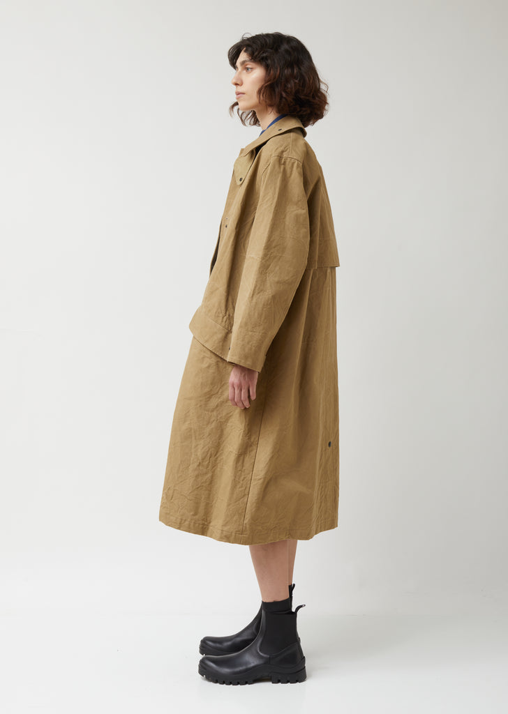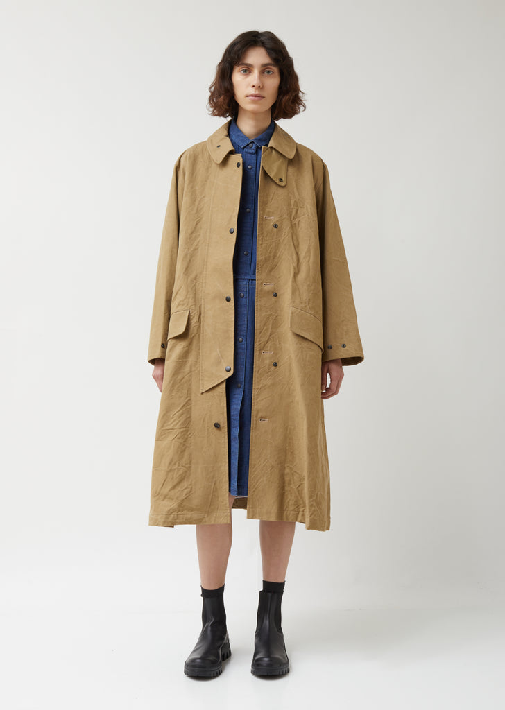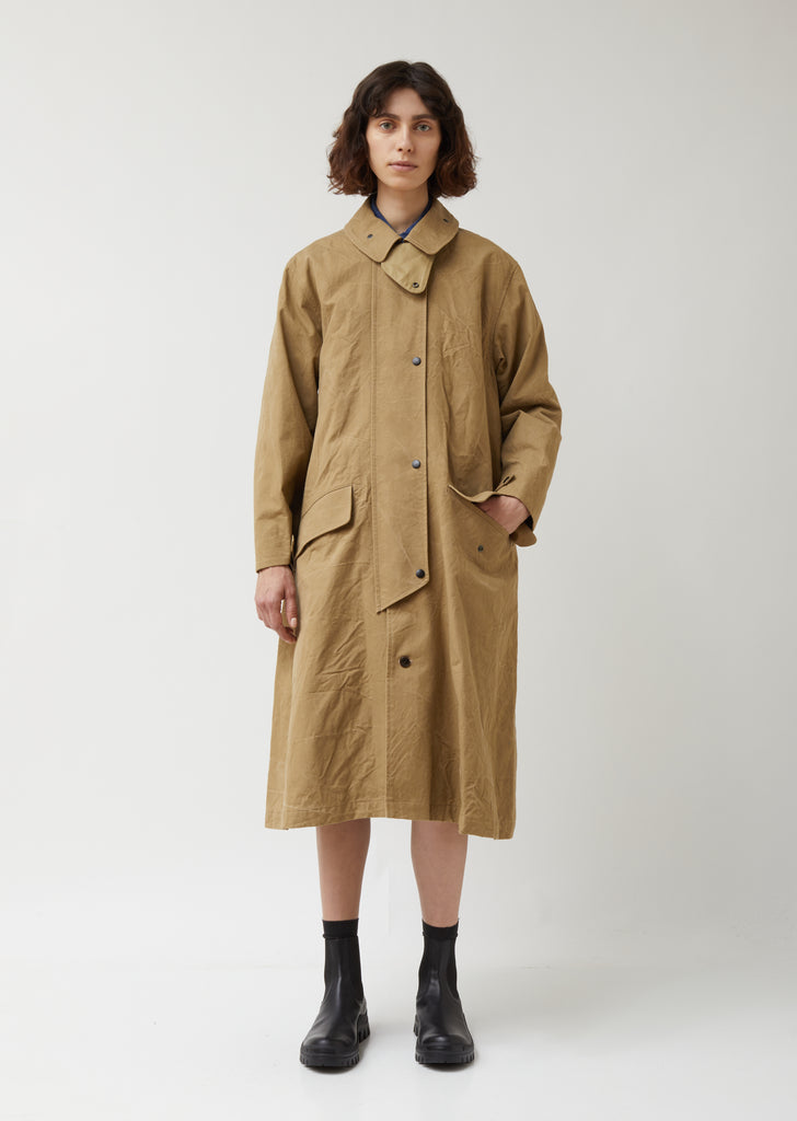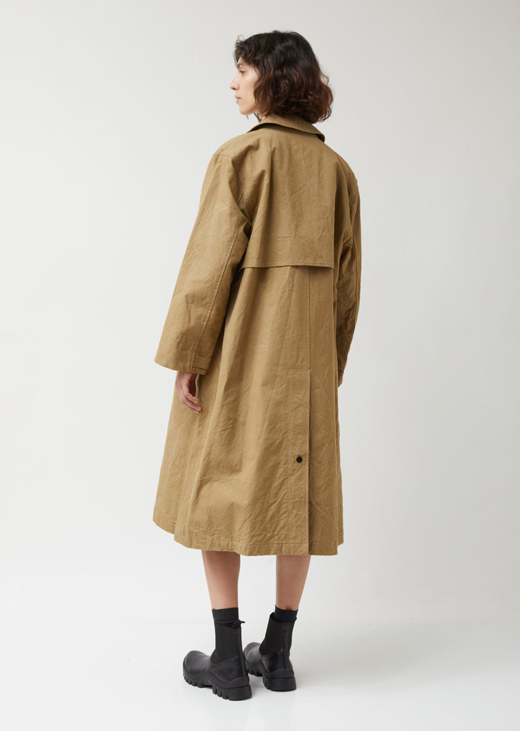 Midi-length single-breasted trench coat crafted from medium-beige cotton twill. Classic collar. Snap-button throat guard. Long sleeves. Sleeve straps. Horn-button front closure is partially concealed with snap-button flap. Flap besom front pockets at hips; concealed snap-button fastening. Rain guard at back. Back vent with snap-button fastening. Black snap buttons. Straight, over-the-knee hem. Straight, relaxed fit.