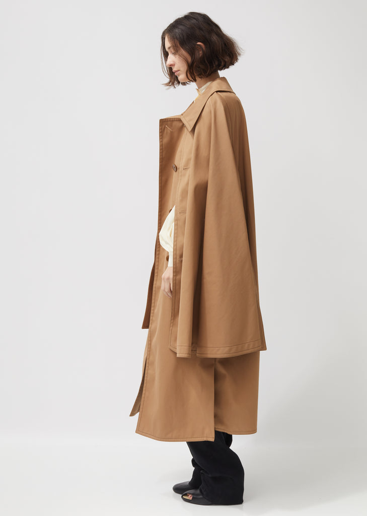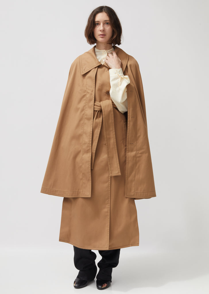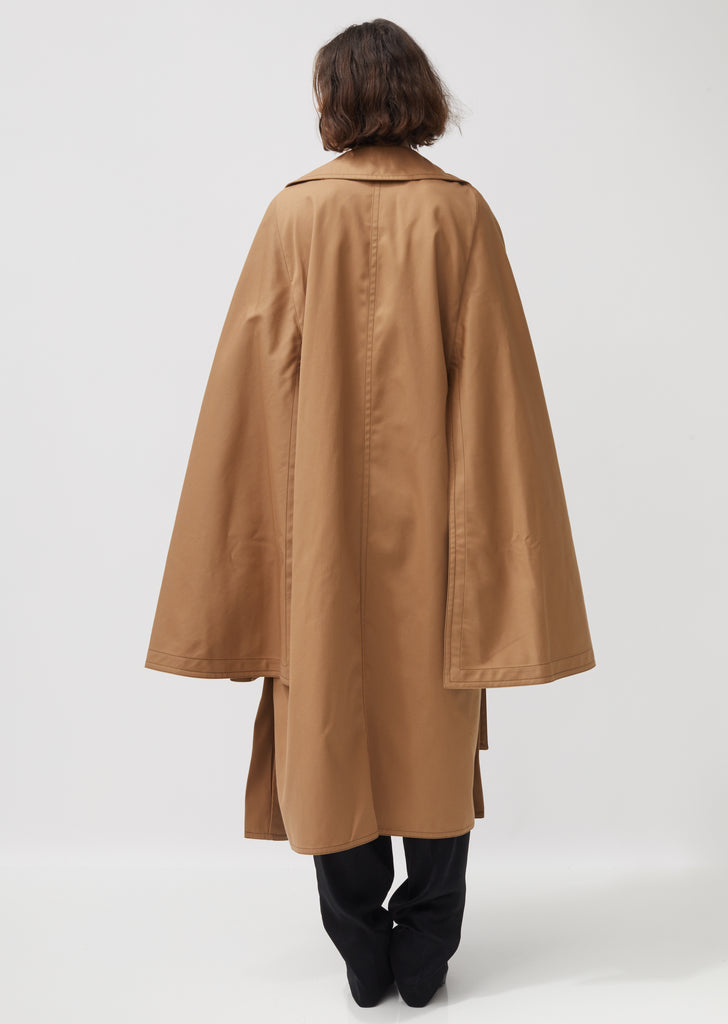 Light-brown hybrid cape coat in crisp, dry-hand cotton broadcloth—a sleeveless design featuring a removable cape, double-breasted closure, and additional fastening from an optional self-belt.
