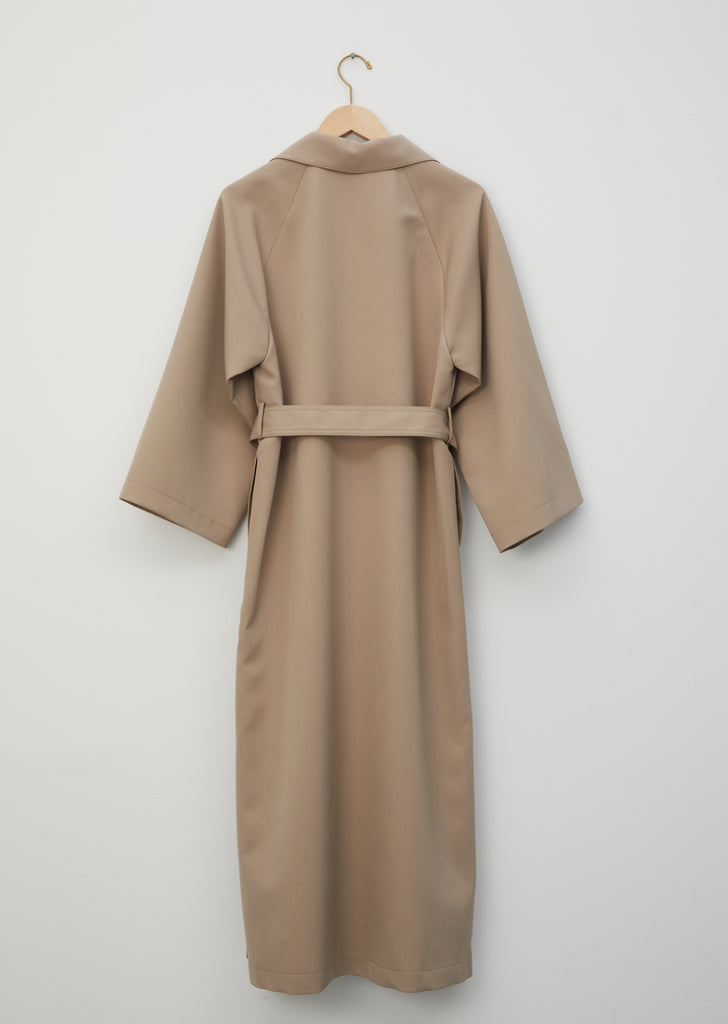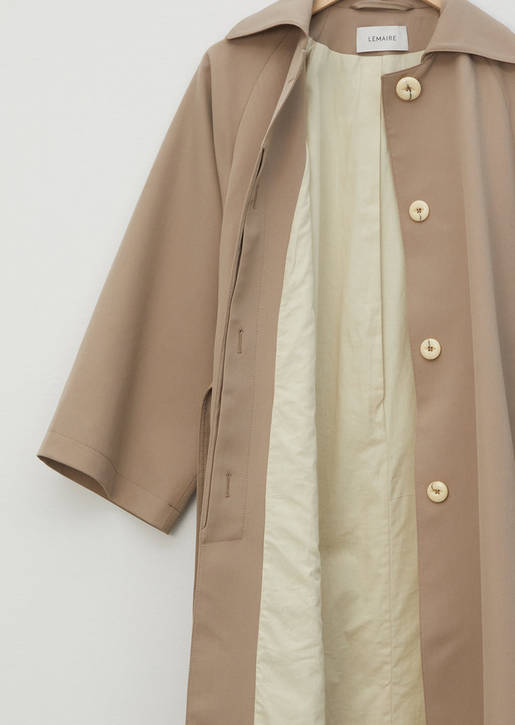 Lemaire Soft Coat in beige grey cotton twill with self belt. This single-breasted coat has wide bracelet length sleeves and open side vents accented with contrast buttons.
