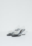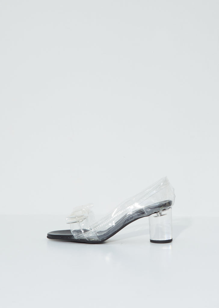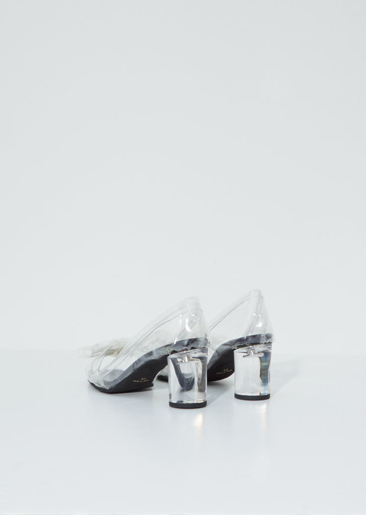 Comme des Garçons open-toe pumps with bow detail at upper and rounded heel in PVC. Footbed in contrast black.