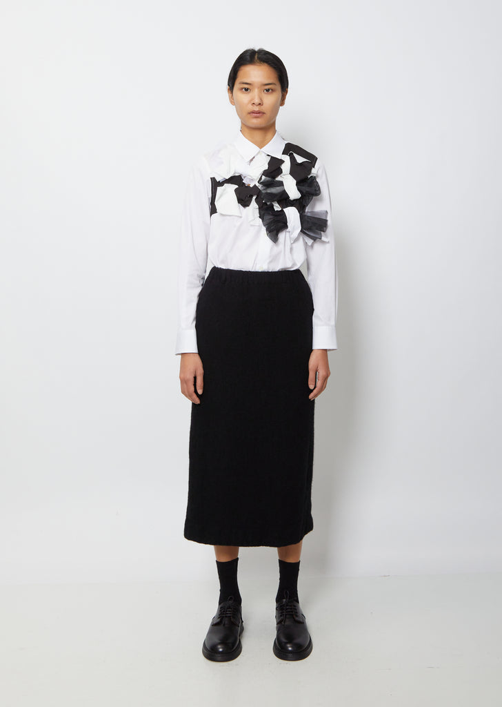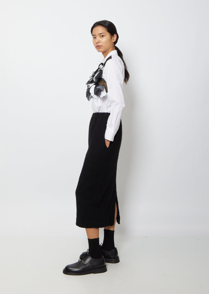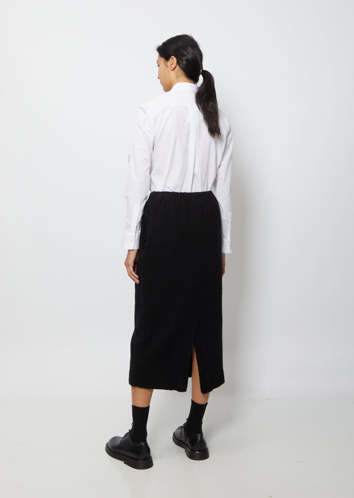 Comme des Garçons black drawstring midi skirt in a textured wool and nylon blend. Features an inner drawstring at elasticized waistband with a back vent at hem. Double side slit pockets. Straight cut.