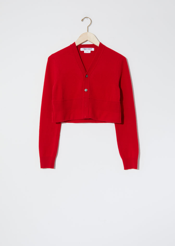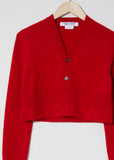 CdG CdG Worsted Wool Cropped Cardigan in Red. Traditional cardigan sweater with foldover hem effect for a cropped length in a worsted wool. Finished with rib trim at neckline and sleeve cuffs.