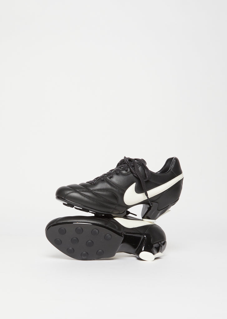 Comme des Garçons x Nike FW'21 collaboration premier heeled lace-up sneakers in a black smooth quilted leather, with inspiration taken from Nike's 1992 football boot. Also available in White