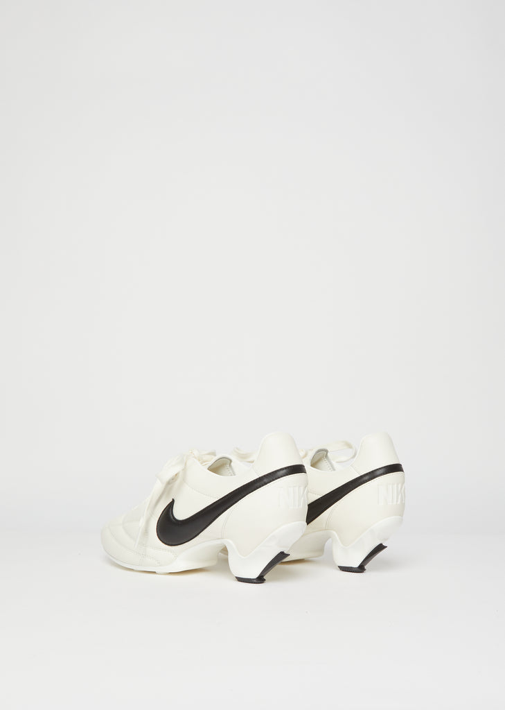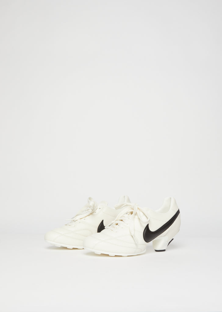 Comme des Garçons x Nike FW'21 collaboration premier heeled lace-up sneakers in a white smooth quilted leather, with inspiration taken from Nike's 1992 football boot. Also available in Black