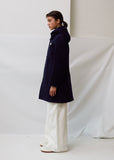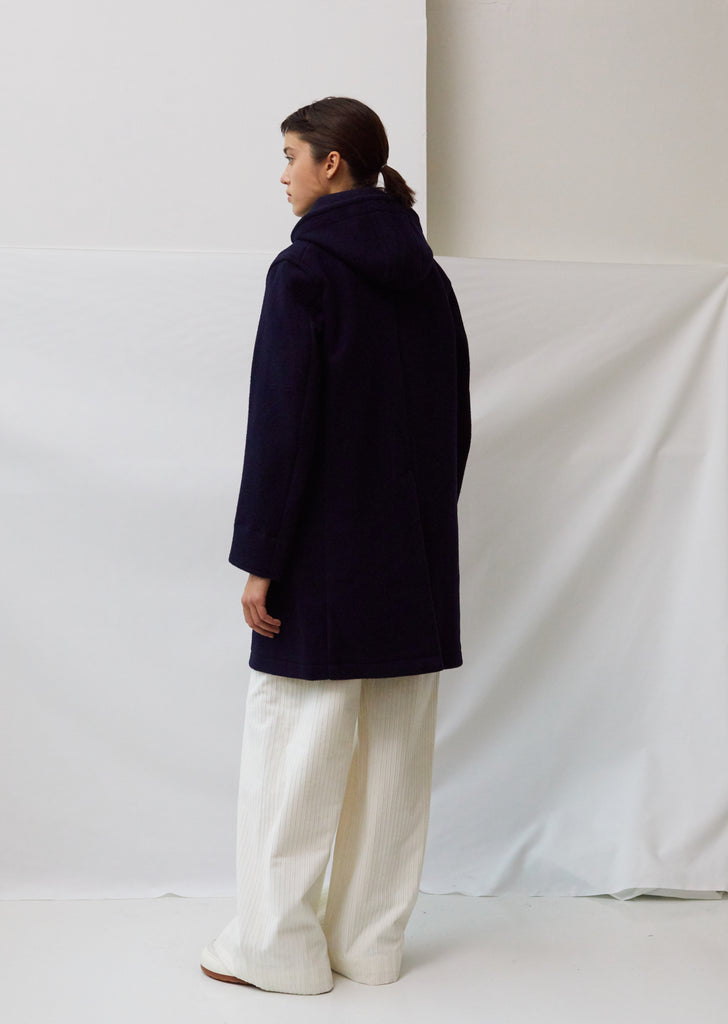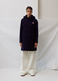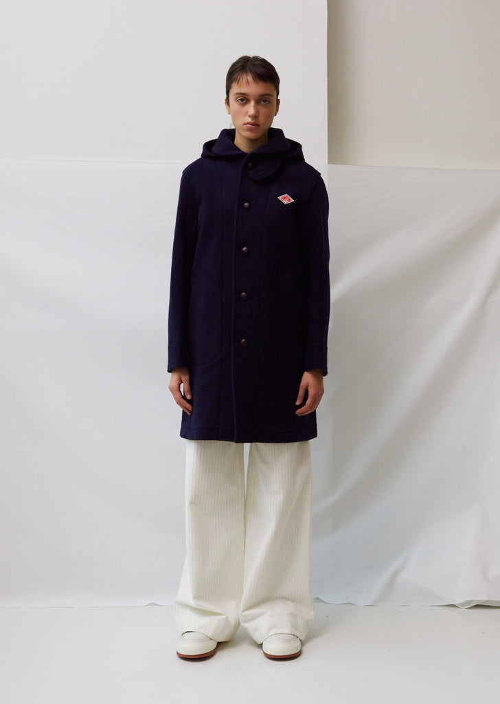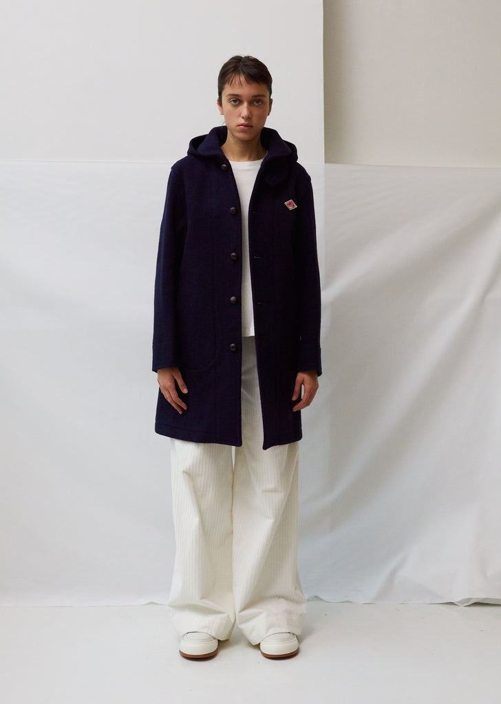 Unisex mid-length hooded coat made from navy brushed wool melton. Paneled construction. Attached hood. Cutaway club collar. Single-button throat latch. Long sleeves. Button placket. Brown cowhide knot buttons. Red-and-white embroidered logo patch at chest. Viennese seams at back. Angled welt front pockets. Center vent at back hem. Straight hem falls to upper thigh. Straight, relaxed fit.