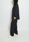Camiel Fortgens oversized wool suit jacket in navy & off-white pinstripe. Featuring a classic notch collar, single welt pocket at left and fully lined in off-white cotton. 4-button front closure.
