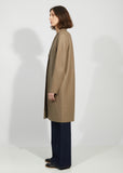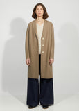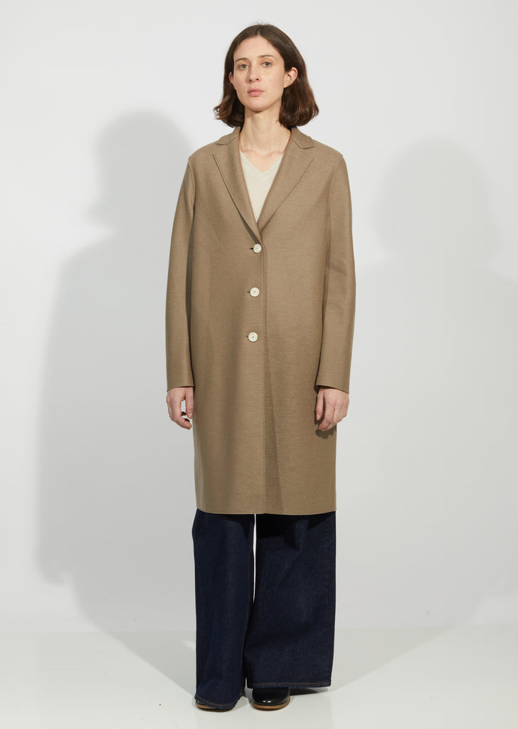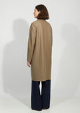 Taupe-colored single-breasted overcoat in wool felt, designed with on-seam side pockets and finished with raw edges throughout.