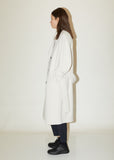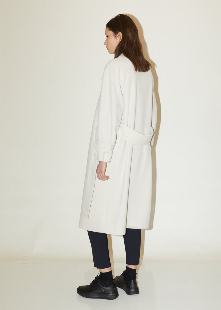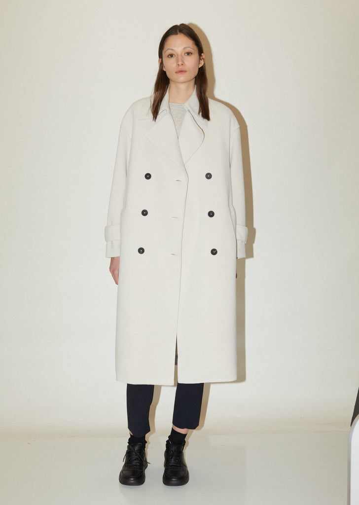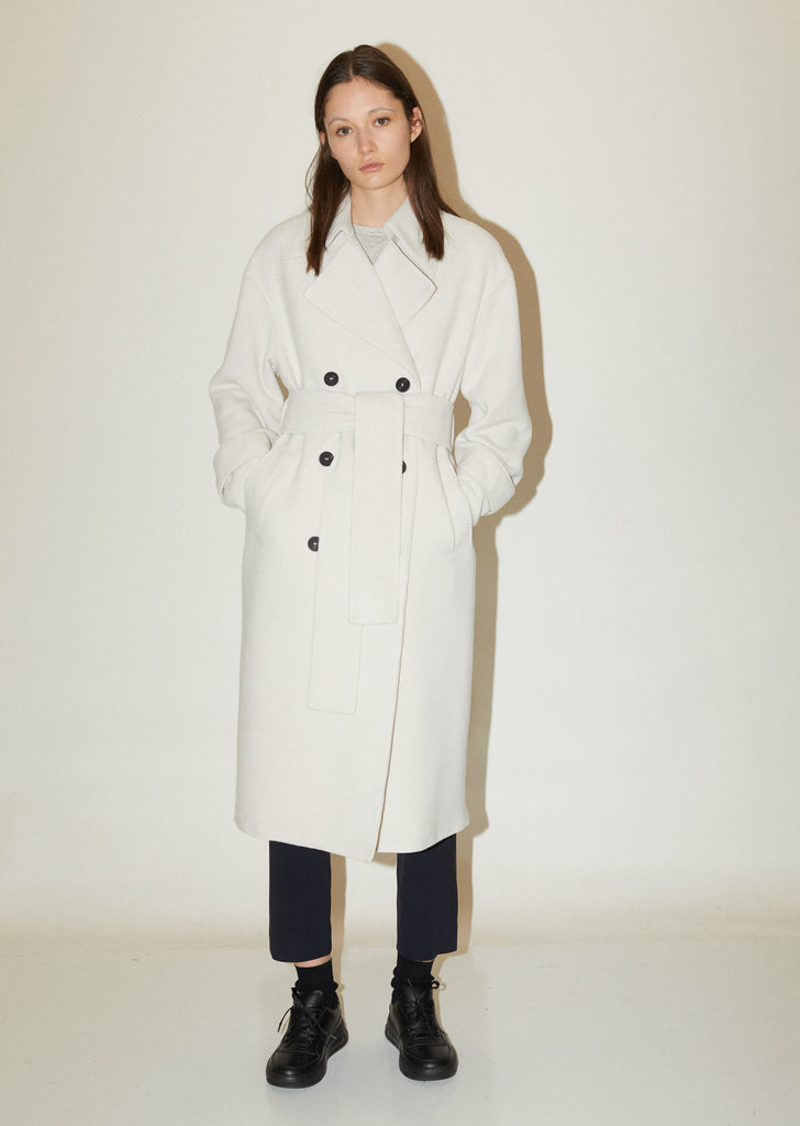Ultra-soft wool felted double-breasted coat with self belt in a soft white. Notch lapels. Drop shoulders. Long two-piece sleeves. Wide buttonless sleeve straps. 6x3 double-breasted closure. Flat self-belt. Belt loops at sides of waist. Angled welt side pockets. Back shoulder yoke. Straight, over-the-knee hem. Finished with black contrast buttons. Straight, generous fit.