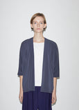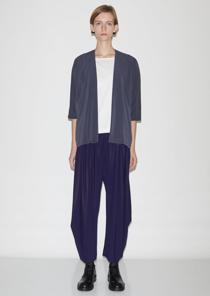 Draped kimono-inspired top in dark-grey jersey, featuring an open front, three-quarter kimono sleeves, and a slight high-low hem. Collarless. Half-moon yoke at back. Fabric drapes into soft folds. Fluid, unstructured silhouette.