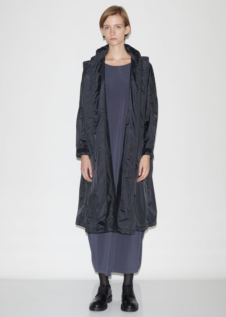 Black midi coat in vertical panels of lustrous tech-taffeta, designed with a zip-out hood and a gently flared silhouette.