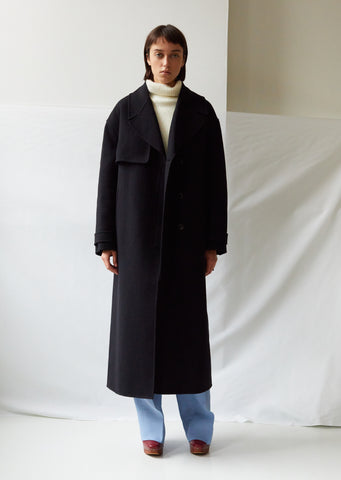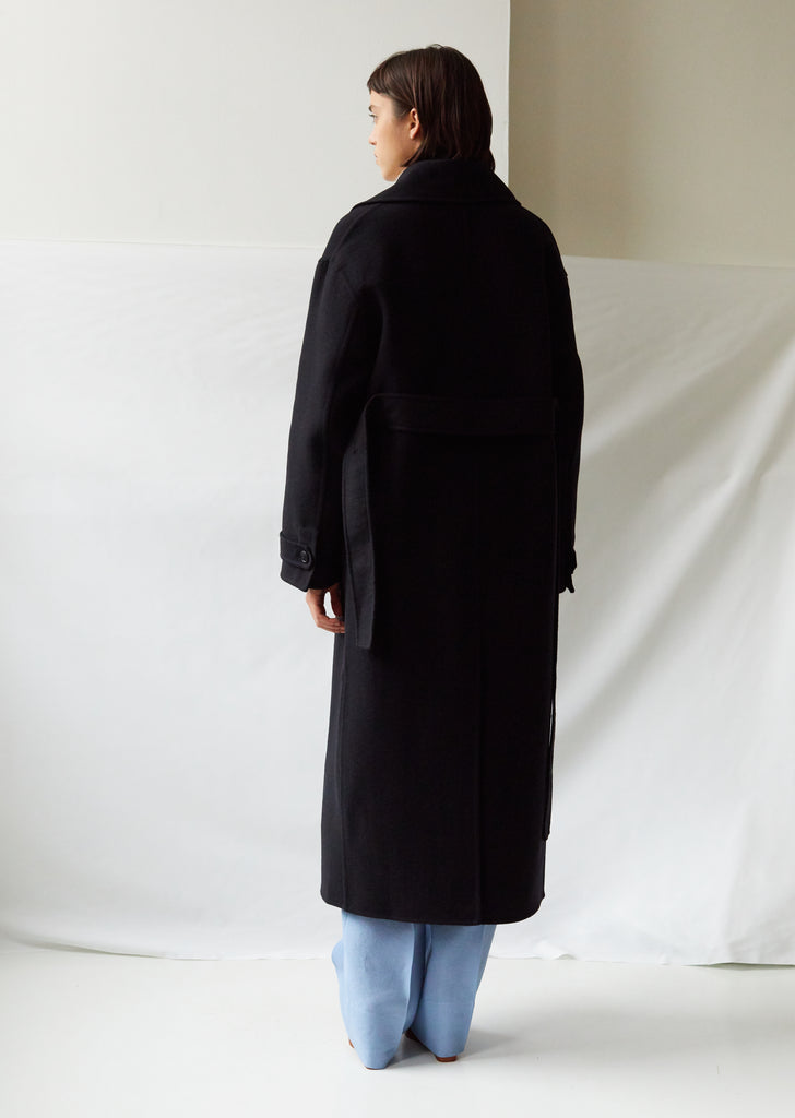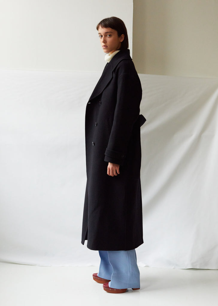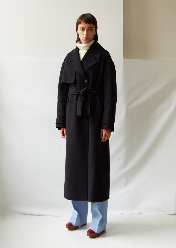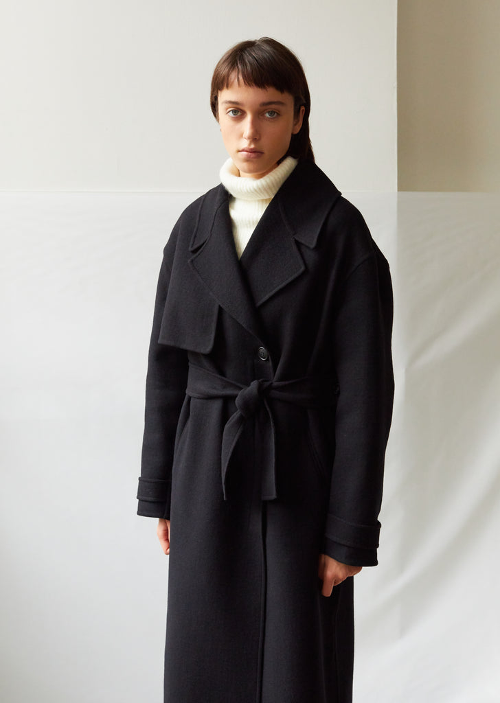 Double-breasted maxi trench coat in black virgin-wool melton, finished with a partially concealed button placket and an optional self-tie belt. Wide notch lapels. Drop shoulders. Long sleeves. Sleeve vents. Single-button sleeve straps. Gun flap. Exposed top button at placket. Angled besom side pockets. Center vent at back hem. Straight hem falls to lower calf. Semi-fitted bodice. Straight-fit skirt.