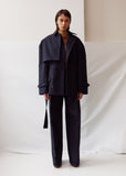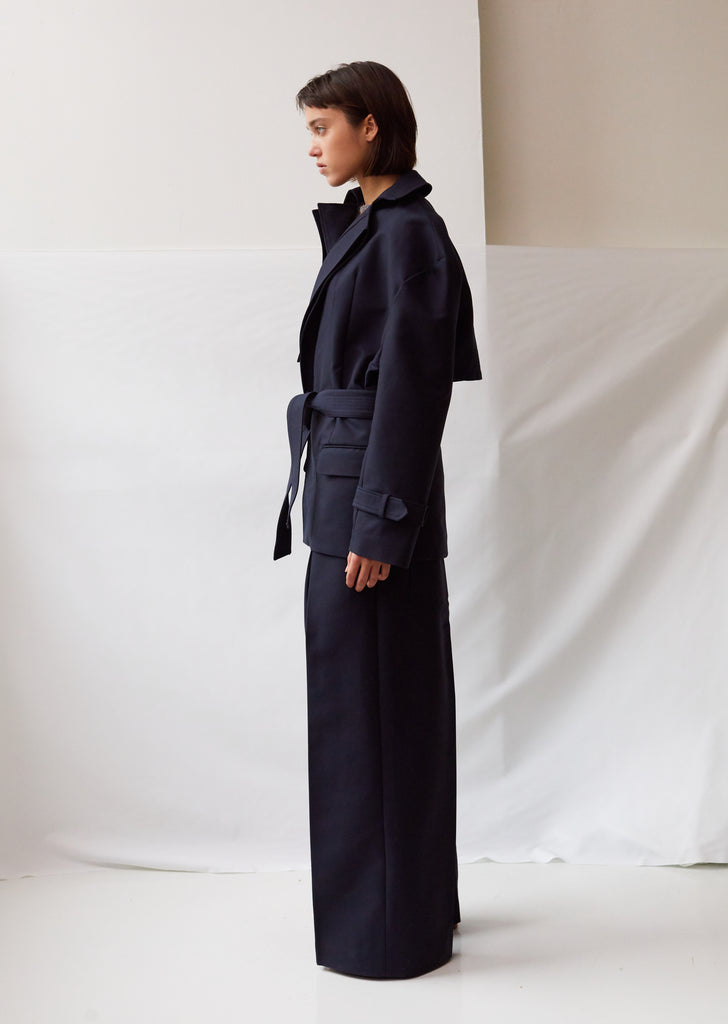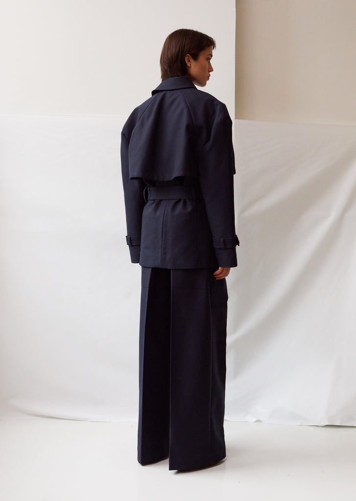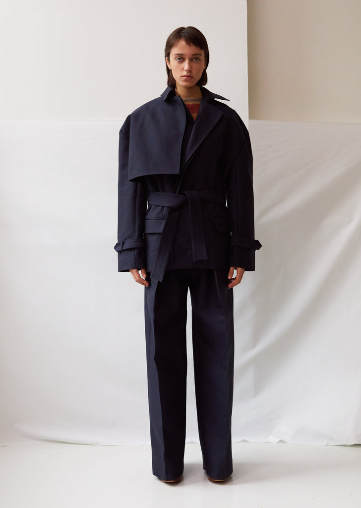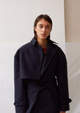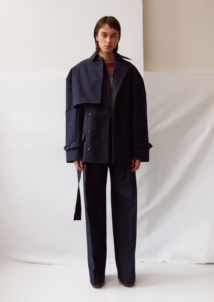 Double-breasted trench-inspired jacket crafted of navy cotton-blend canvas. Spread collar. Notch lapels. Drop shoulders. Long two-piece sleeves. Adjustable angled-tab sleeve straps. Gun flap. Concealed three-button placket. Darting at front waist. Flap besom front pockets. Optional channel-stitched self-belt. Two belt loops at back waist. Rain guard. Straight hem. Slightly oversized fit. Lined.