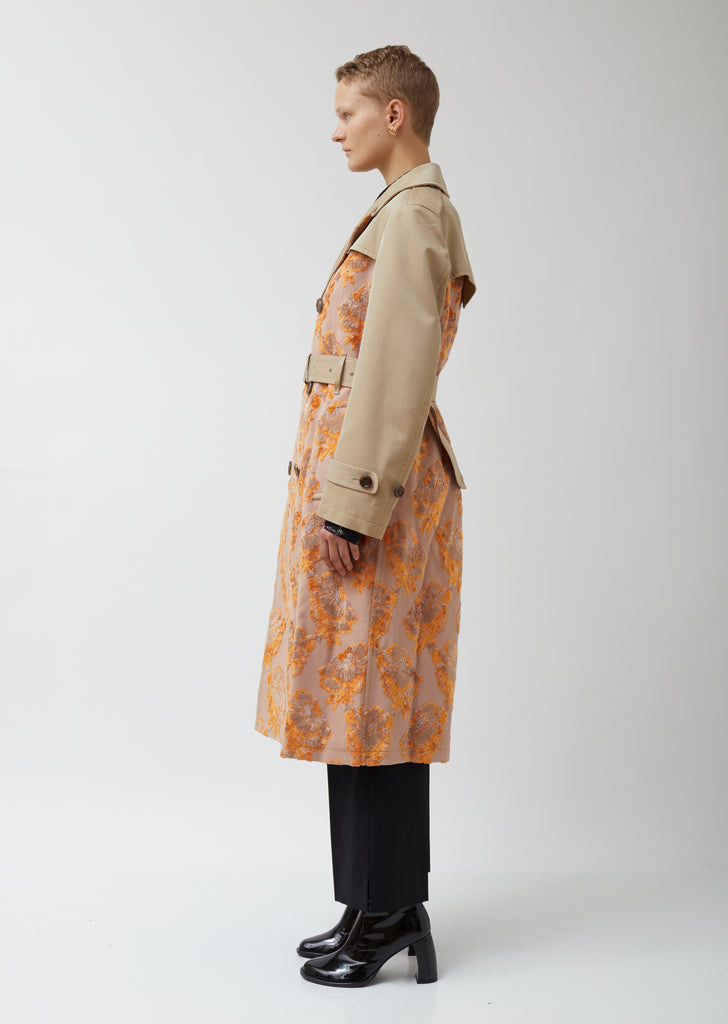Textured pink-and-orange cotton-blend jacquard trench coat designed with a contrast, light-beige cotton-twill belt, rain guard, lapels, shoulders, and sleeves. Notch lapels with stitched buttonholes. Buttoned epaulets. Long sleeves. Pin-buckle sleeve straps. 6x3 double-breasted closure. Welted side pockets. Flat pin-buckle belt. Buttoned rain guard. Contrast, dark-brown horn buttons. Center-back vent. Straight, over-the-knee hem. Classic fit.