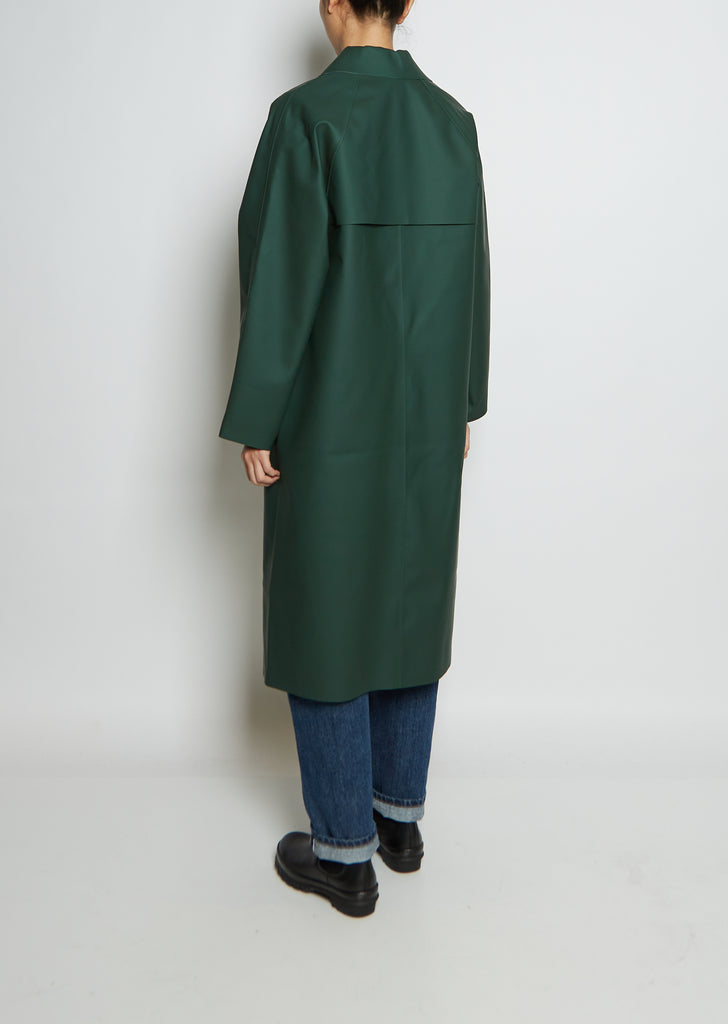 Kassl signature long rain coat with a spread collar and front flap pockets in moss green water-repellent rubber. This style fetaures taped seams, storm flap and raglan sleeves.
