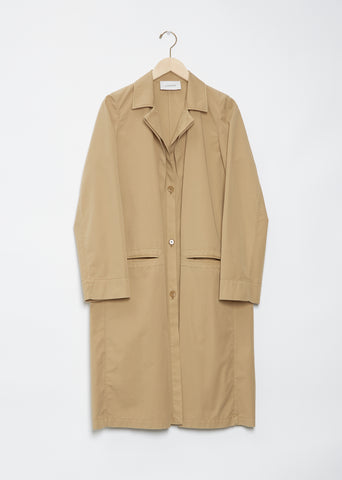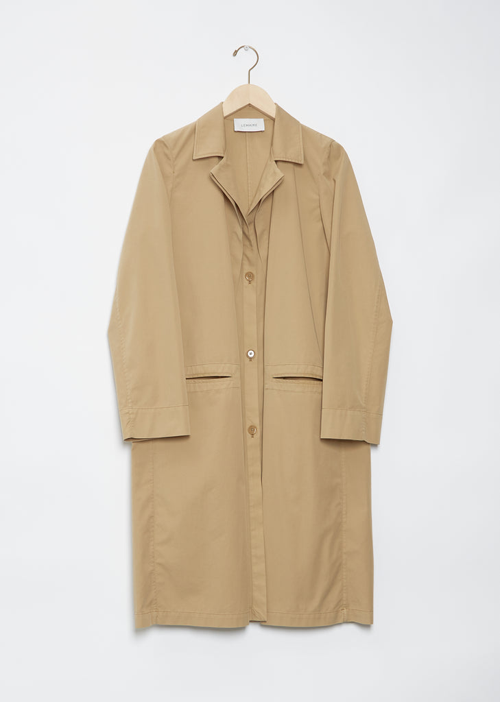 Lemaire beige double front layered trench coat in a washed cotton twill.
