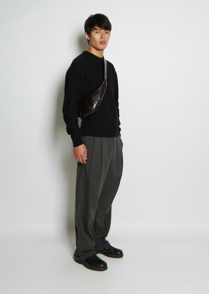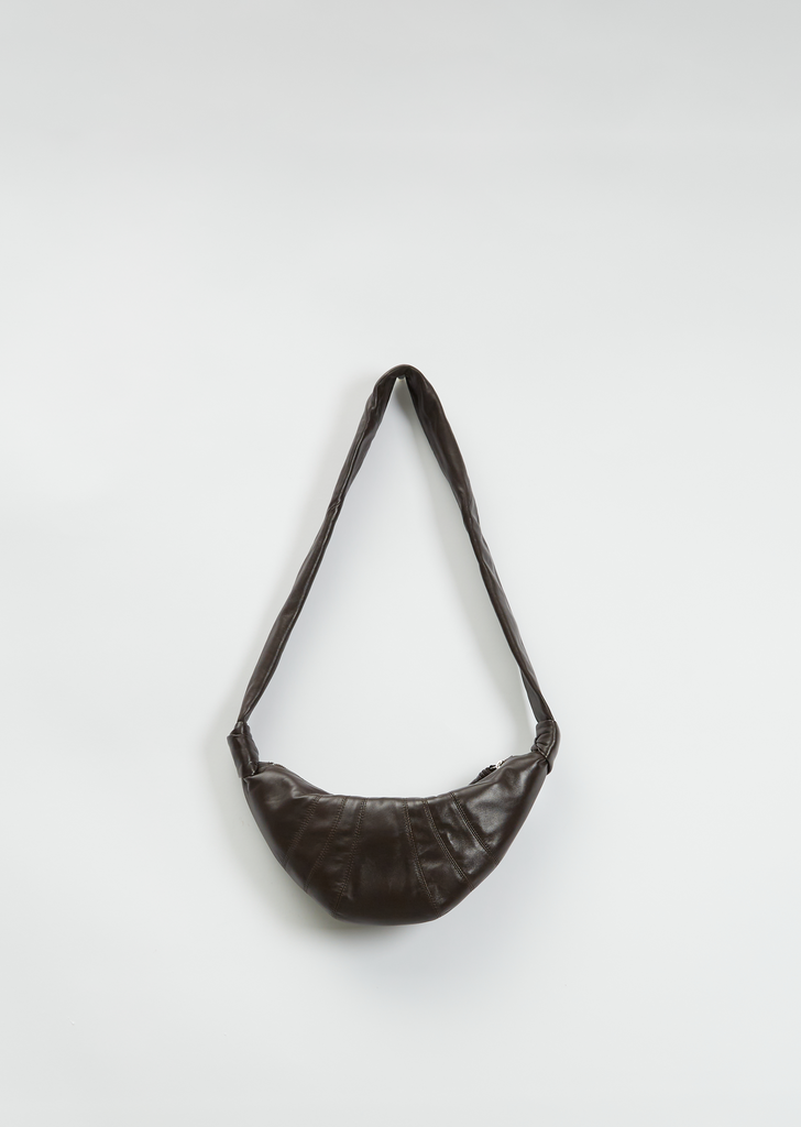Lemaire signature small croissant-shaped shoulder/crossbody bag with topstitching cutout detail, side-knotted strap and a tassel zip-top pull in smooth dark chocolate brown nappa leather.