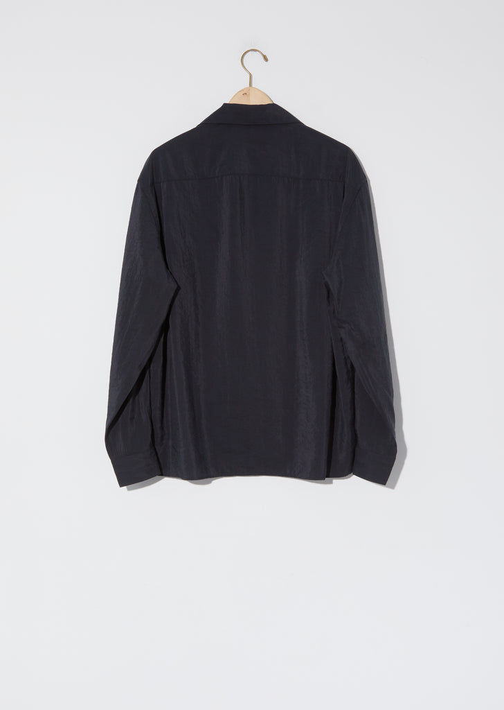 FW'20 Collection — Lemaire Unisex Convertible Collar Shirt in Coal. Crafted in a sand washed silk blend, faded black safari shirt with double-flap pockets and convertible spread collar.