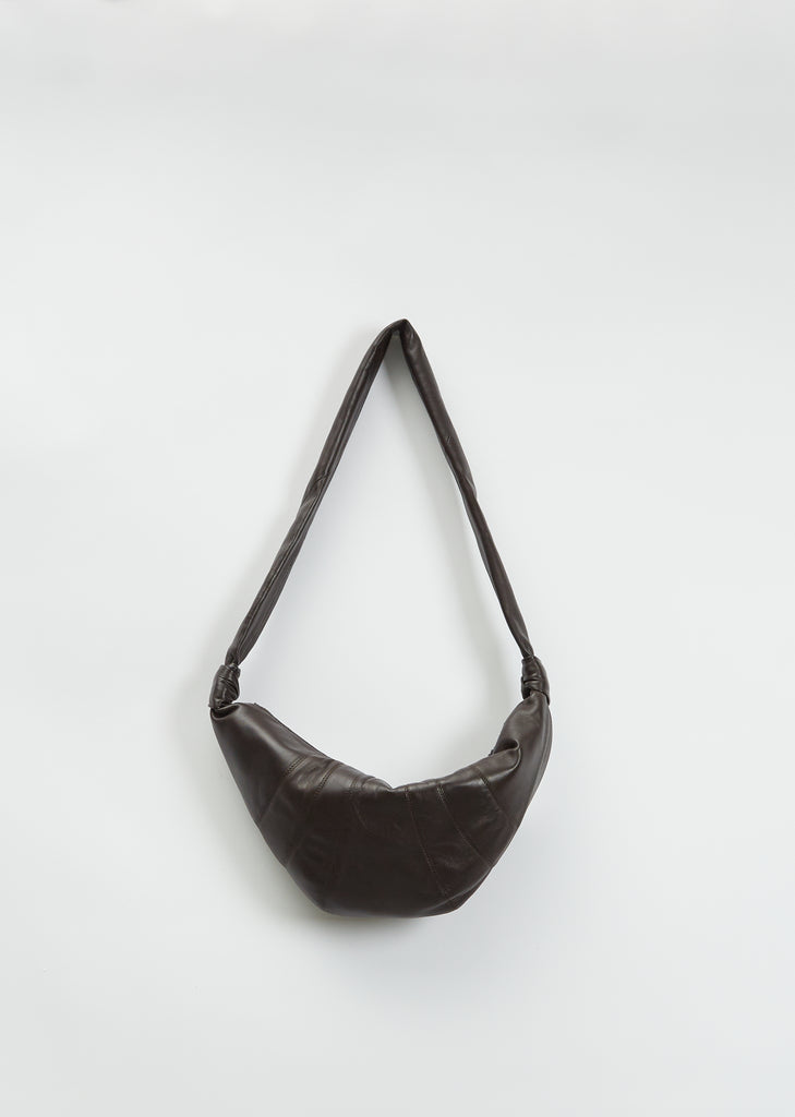 Lemaire signature medium croissant-shaped shoulder/crossbody bag with topstitching cutout detail, side-knotted strap and a tassel zip-top pull in smooth dark chocolate brown nappa leather.