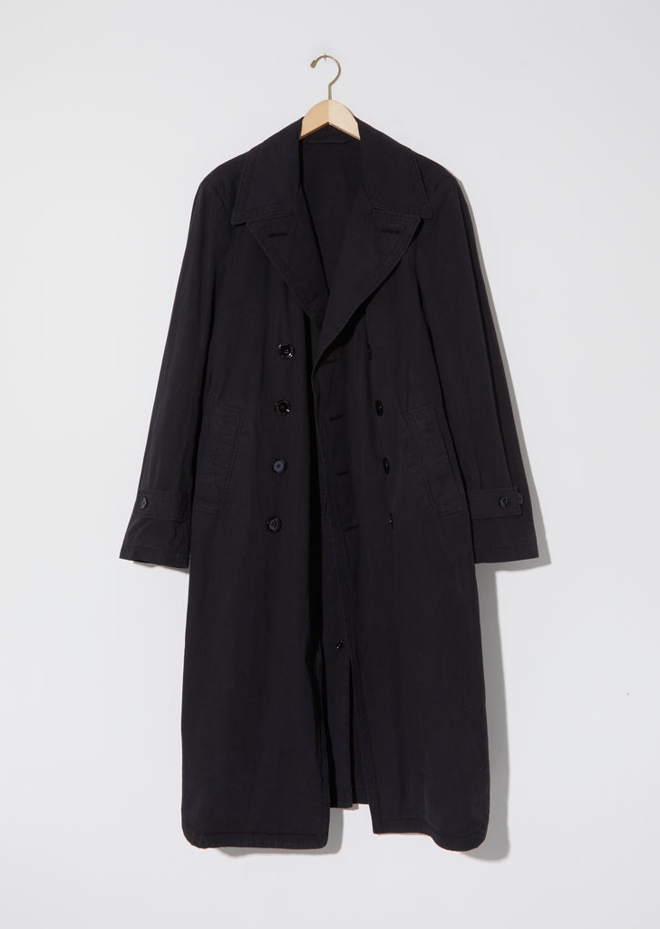 FW'20 Collection — Lemaire Unisex Cotton Trench Coat in Black. Double-breasted trench coat in washed cotton with classic trench tailoring featuring self lined light padding in the front for warmth.