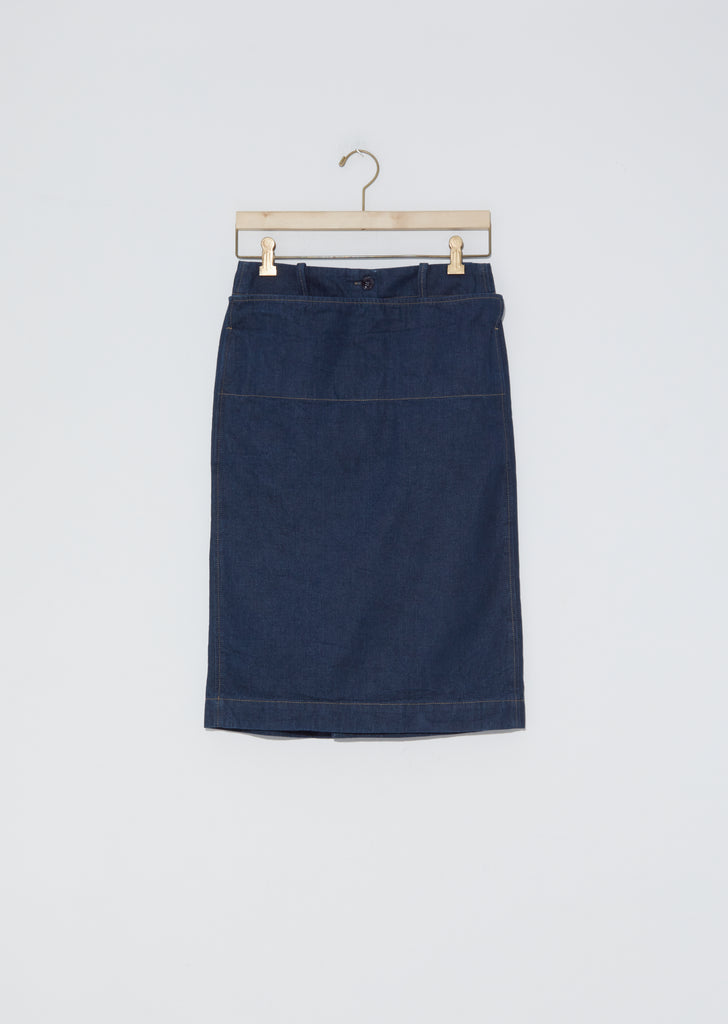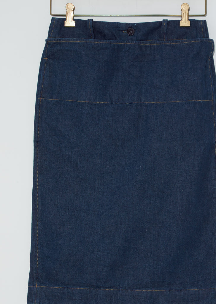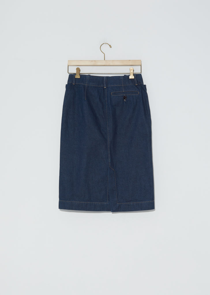 Lemaire denim straight skirt in Jean Blue wash with buttoned open front panel overlay. Button-fly fastening closure. Detailed with belt loops and single welt pocket at back. Yellow topstitching throughout. Relaxed fit.