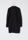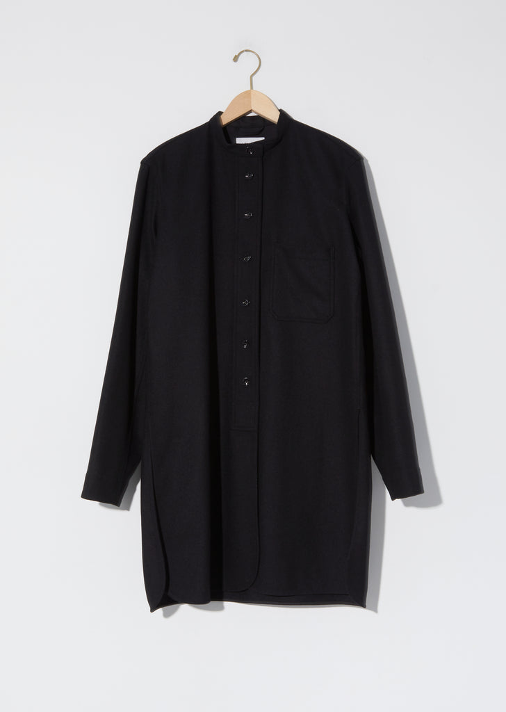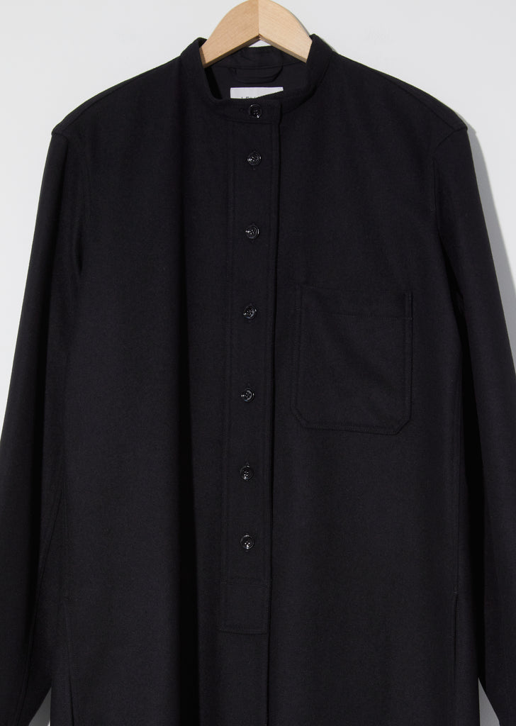 FW'20 Collection — Lemaire Liquette in Black. Shirt jacket with a buttoned mandarin collar and high slit shirttail hem in a mid-weight wool blend. Accented with a single patch pocket and two concealed side pockets, this style can be worn as a jacket or dress.